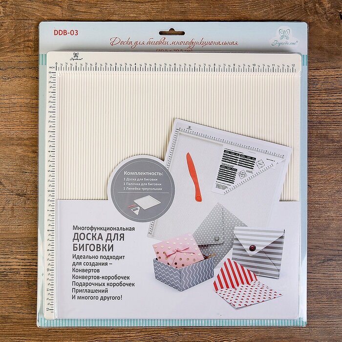 В набор: доска для биговки размером 30,5х30,5 см с линейками и рисками, угольник, палочка для биговки, инструкция с иллюстрациями.