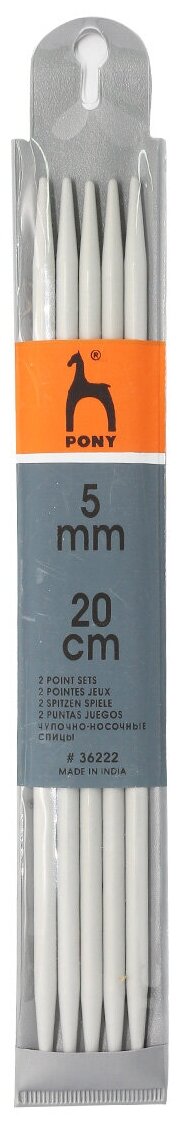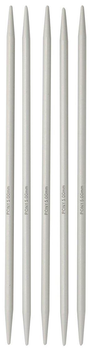 Удобные носочные спицы PONY, предназначенные для вязания чулок, носков, горловин и других бесшовных деталей одежды, порадуют вязальщиц своим качеством. Легкие алюминиевые спицы со скругленными кончиками не травмируют пальцы, идеально подходят для работы с деликатными типами пряжи. Гладкая поверхность спиц, соприкасаясь с пряжей, не нарушает структуру нити. PONY – это всемирно известный индийский бренд, продукция которого востребована на всех континентах мира и славится своим высоким качеством и разнообразным ассортиментом товаров. Вязальные спицы PONY изготовлены из алюминия высокого качества со специальной обработкой. Благодаря электролитическому оксидированию металла спицы имеют оптимальную для вязания гладкую поверхность, отличаются высокой прочностью и упругостью, идеально защищены от коррозии. Длина: 20 см Диаметр спицы: 5 мм