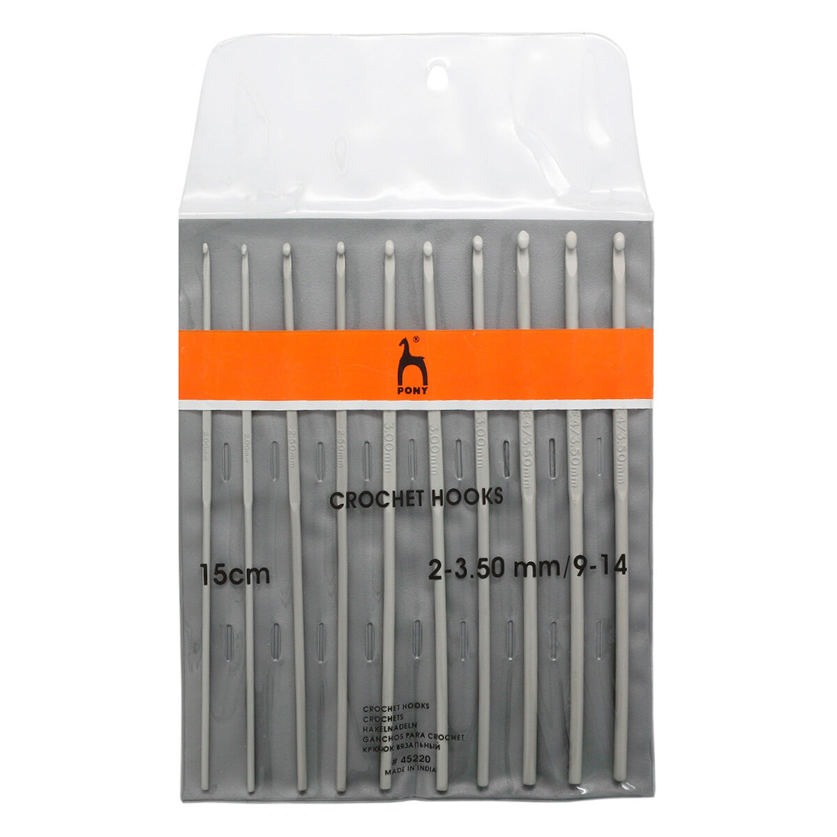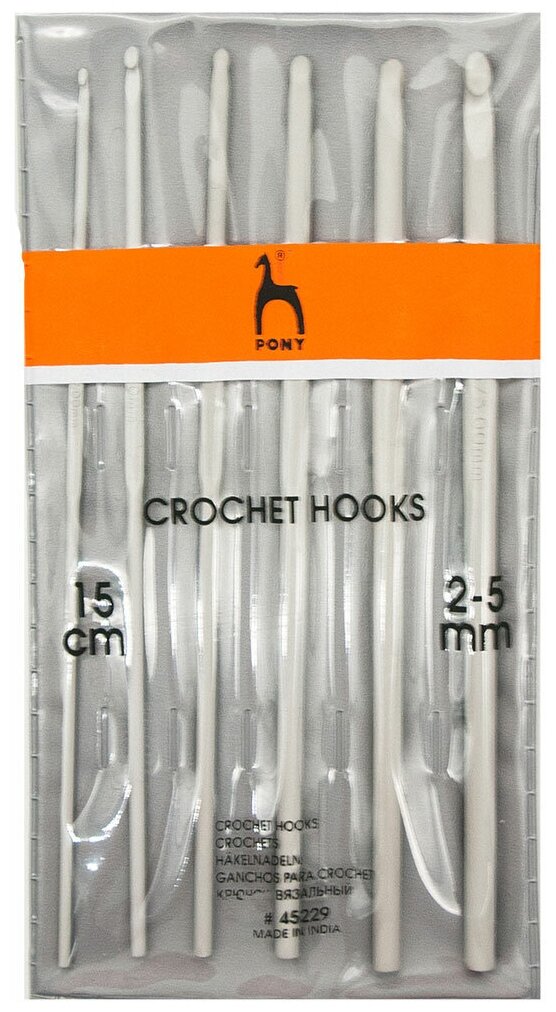 Набор 'Crochet Hooks' от известного бренда PONY включает в себя 10 алюминиевых крючков, подходящих для вязания различных деталей и изделий из тонкой пряжи, а также для плетения кружев из нитей. В комплекте крючки длиной 15 см и диаметром от 2 до 3,5 мм. Набор упакован в мягкий чехол с отделениями, обеспечивающий аккуратное и безопасное хранение инструментов. PONY – это всемирно известный индийский бренд. Продукция PONY продается на всех континентах мира, славится высоким качеством и разнообразным ассортиментом. Набор крючков в чехле - это всегда отличный для вязальщицы.