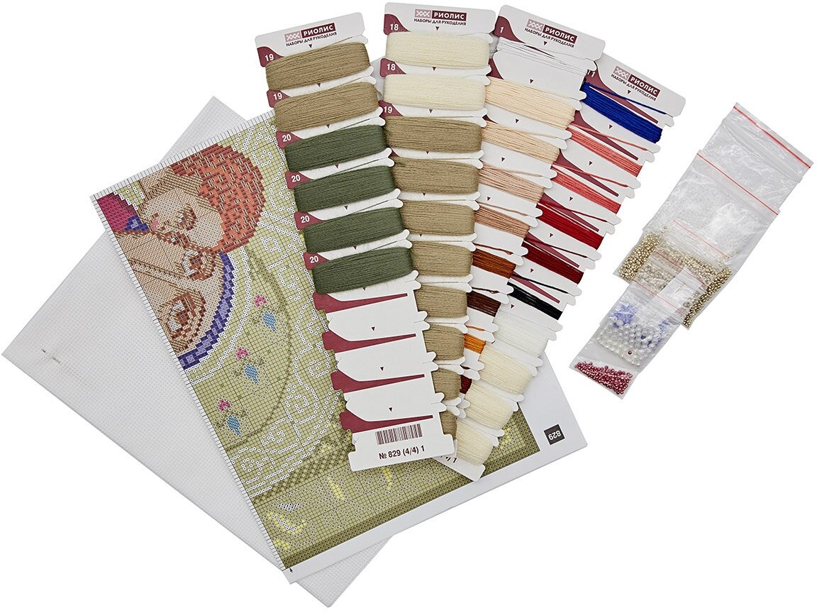 В наборе: канва Aida 14 Zweigart белая, нитки для вышивания (шерсть, хлопковое мулине), бисер, бусины, игла, цветная схема, инструкция.