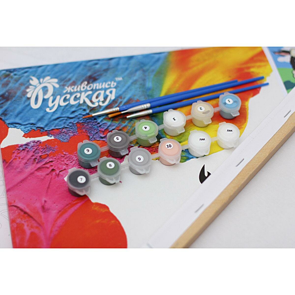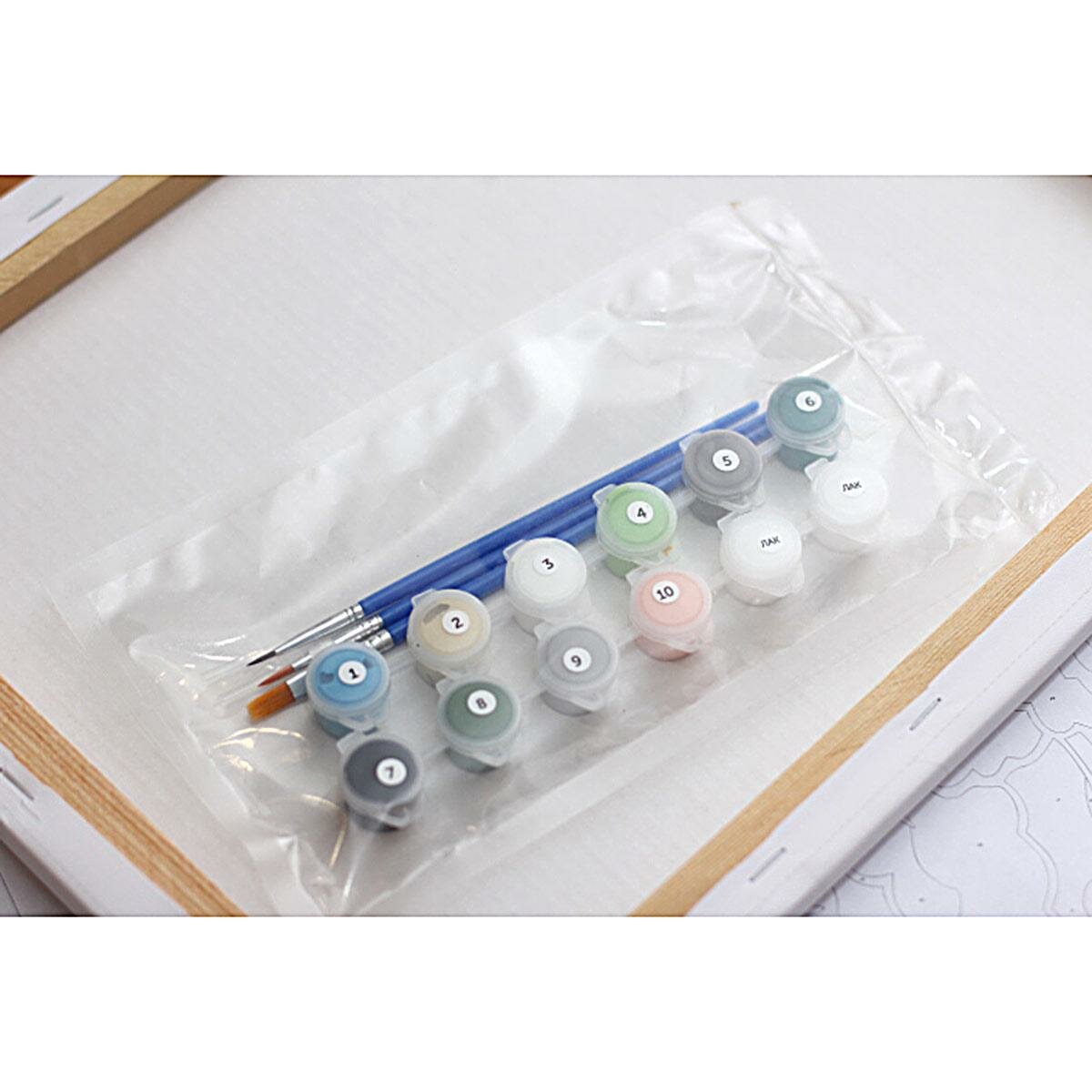 В наборе: пронумерованные краски, холст, подрамник, кисти с нейлоновой щетиной (3 шт.), плоский лайнер, лак, контрольный лист, инструкция.