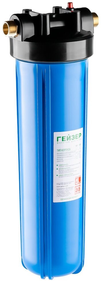 Внимание! Корпус Не комплектуется картриджем! В зависимости от установленного картриджа из воды удаляются механические примеси,хлор,железо,соли жёсткости и др. Корпус для магистрального фильтра. Подходят все картриджи стандарта 20 Big Blue. Предназначен для установки на магистраль холодного водоснабжения. Изготовлен из прочного, армированного, термостойкого пластика.