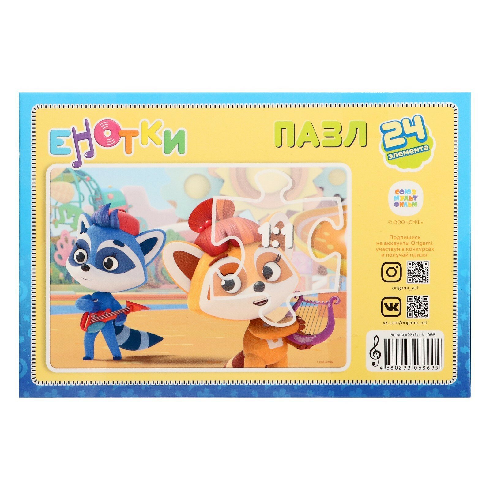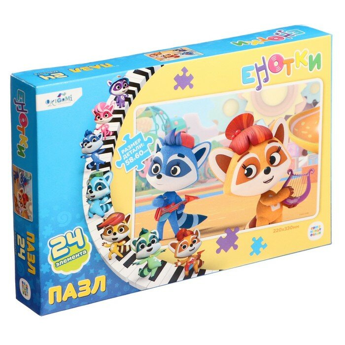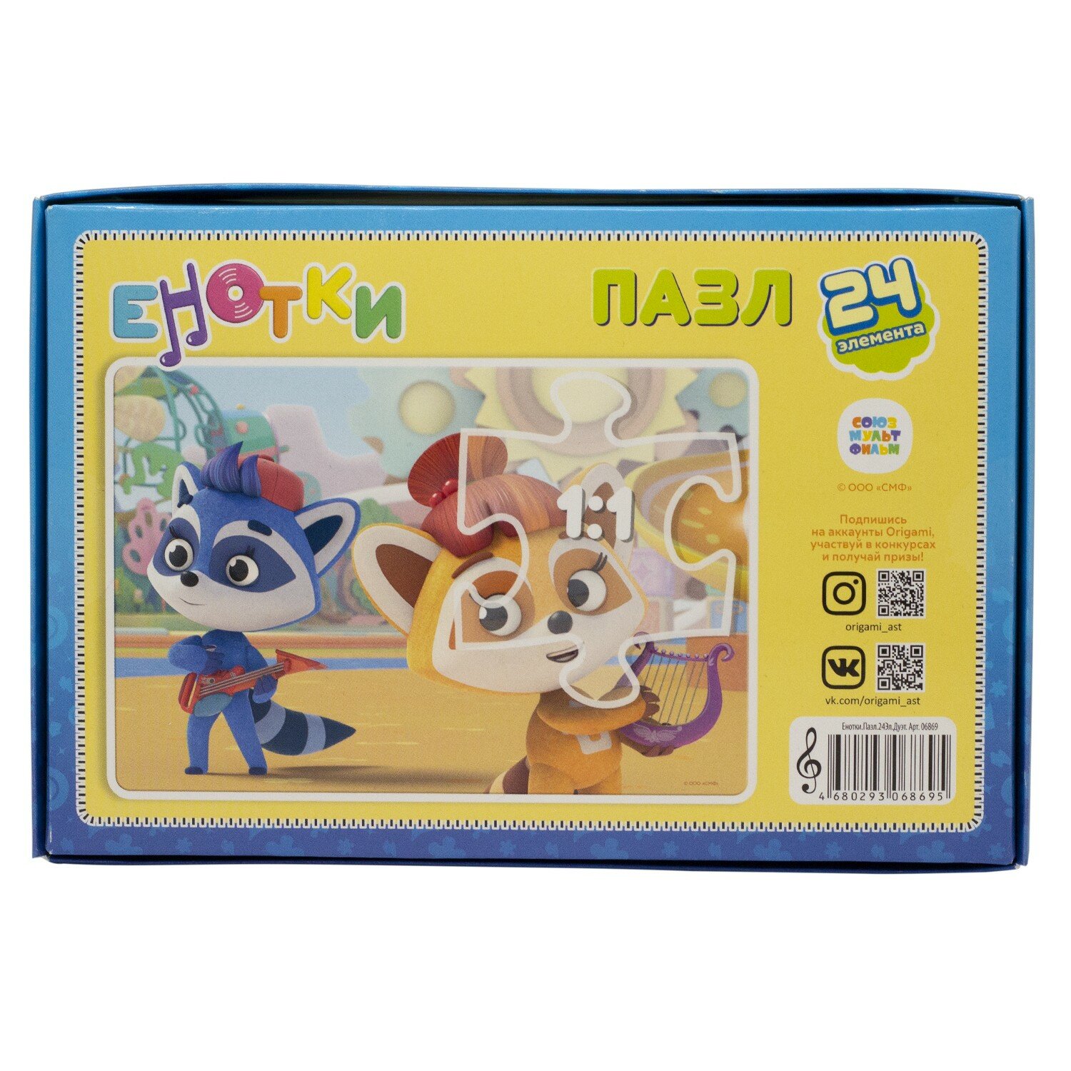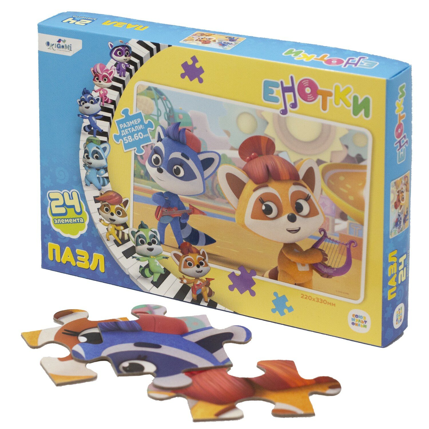 Пазл 24 элемента с забавными героями мультфильма Енотки обязательно понравится малышу, а сборка яркой картинки принесет радость не только детям, но и их родителям. Крупные детали пазла удобно ложатся даже в самую маленькую ручку и их комфортно собирать на полу.