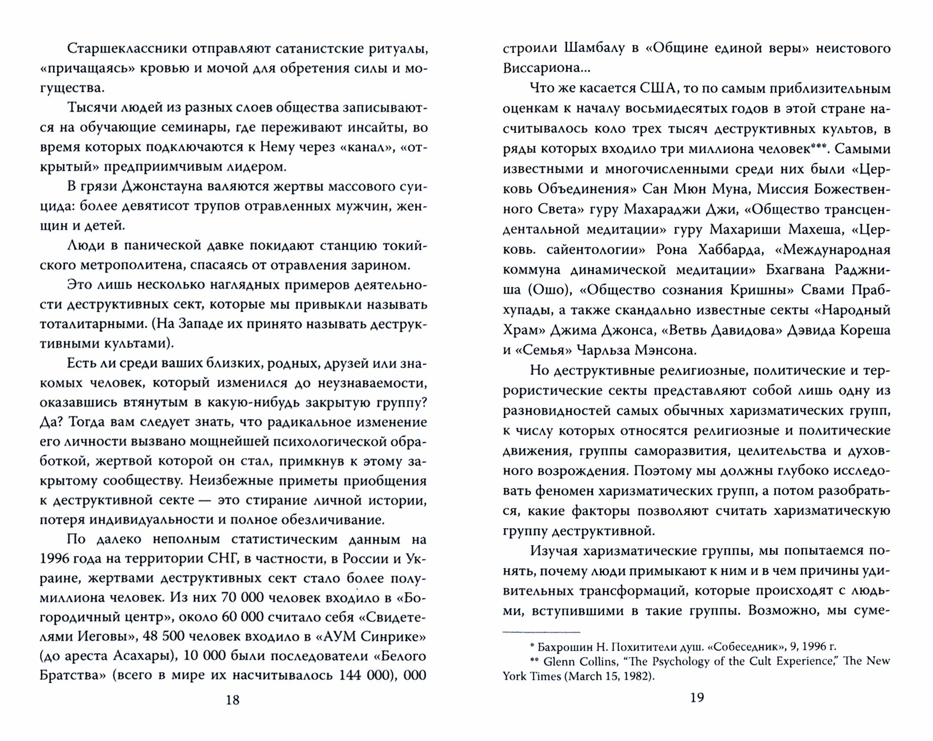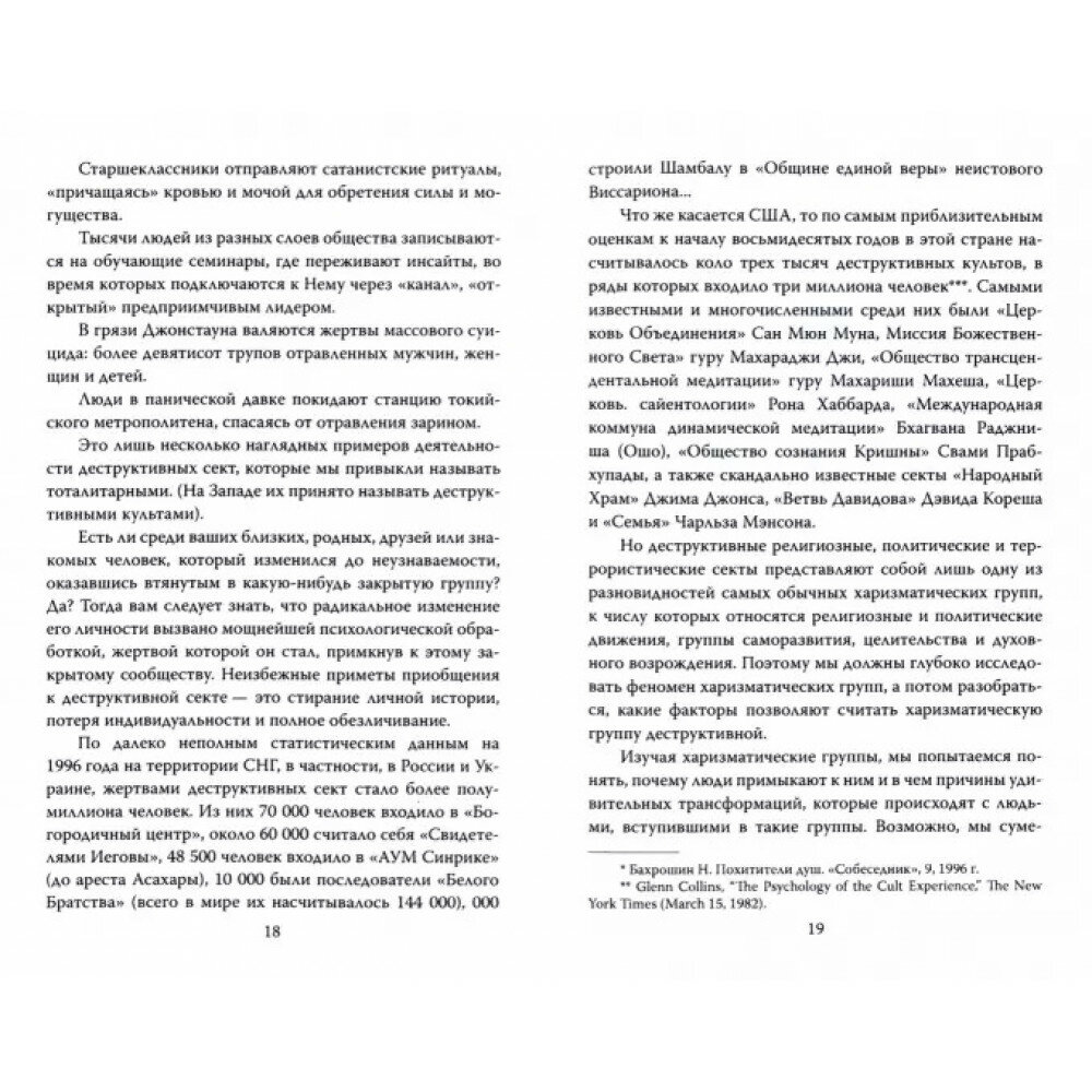 Инфраструктура и маркетинговая политика "духовного" рынка сложна и продуманна, образные системы тщательно подобраны и выверены. "Духовный продукт" на любой вкус: в виде семинаров, книг, кассет, курсов. "Фишка" девяностых - НЛО и ченнелинг. Появились контактеры, владеющие каналом Христа, Вознесенных учителей, Сириуса и трансплутоновой планеты X. Доходный бизнес. За наш счет. Но не все стремятся пополнить ряды очередного "Белого Братства". И тогда в ход идут деструктивные психотехники