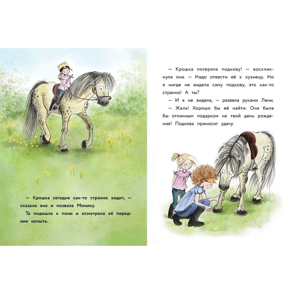 Продолжаем читать истории о маленьком привидении по имени Чих и его подружке девочке Лени: новая часть называется «Счастливая подкова». На этот раз Лени сообщает Чиху о своем Дне рождения и приглашает привидение в гости на торжество. Конечно, Чих не знает, как люди празднуют дни рождения, но из подслушанного разговора подружек Лени он понял, что на день рождения полагается дарить подарки, а потом еще узнал, что подарки можно КУПИТЬ! Вот это ему знакомо! Он знает, что покупать нужно за деньги, и знает, где они лежат! Недолго думая, Чих забирает деньги из кассы школы верховой езды и отправляется за подарком для Лени. Он совершенно искренне считает, что если он знает, где лежат деньги, то спокойно может ими воспользоваться, и совершенно не представляет, чем это может обернуться для его подруги! В результате тренер заподозрила в исчезновении денег саму Лени, так как девочка - одна из немногих, кто знал об их существовании. Лени чуть было не лишилась празднования Дня рождения, но Чих вовремя понял свою ошибку и постарался ее исправить! И без подарка Лени тоже не осталась: Чих подарил ей подкову для пони Крошки – то, о чем девочка мечтала больше всего! Но как к маленькому привидению попала потерянная Крошкой подкова? Об этом узнаете, прочитав очередную историю о приключениях любимых героев.