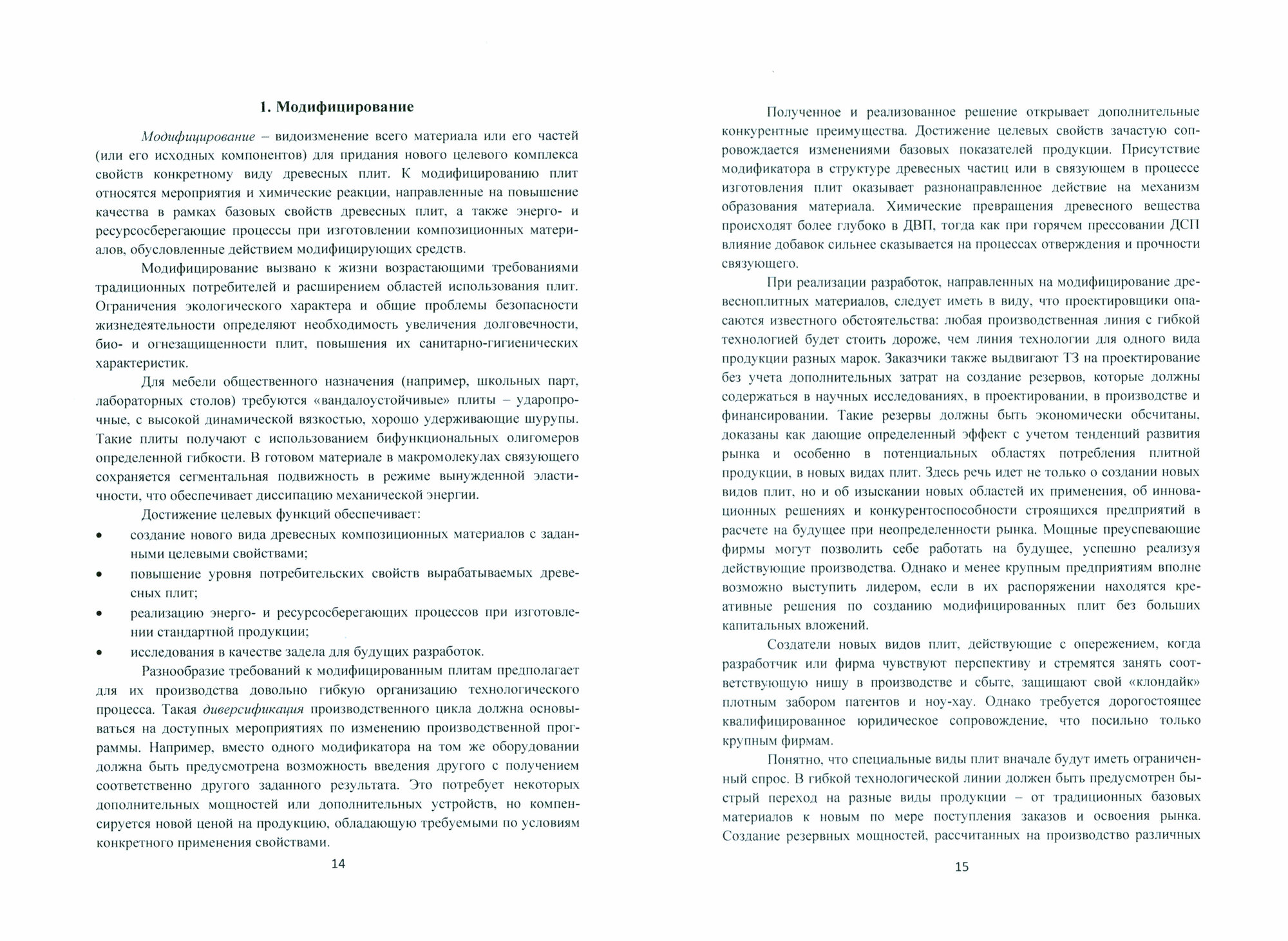 Представлены основные направления и конкретные технические решения модифицирования древесных плит. Выделены отдельные типичные принципы модифицирования, их обоснование и сущность, рассмотрение сопровождается конкретными примерами.