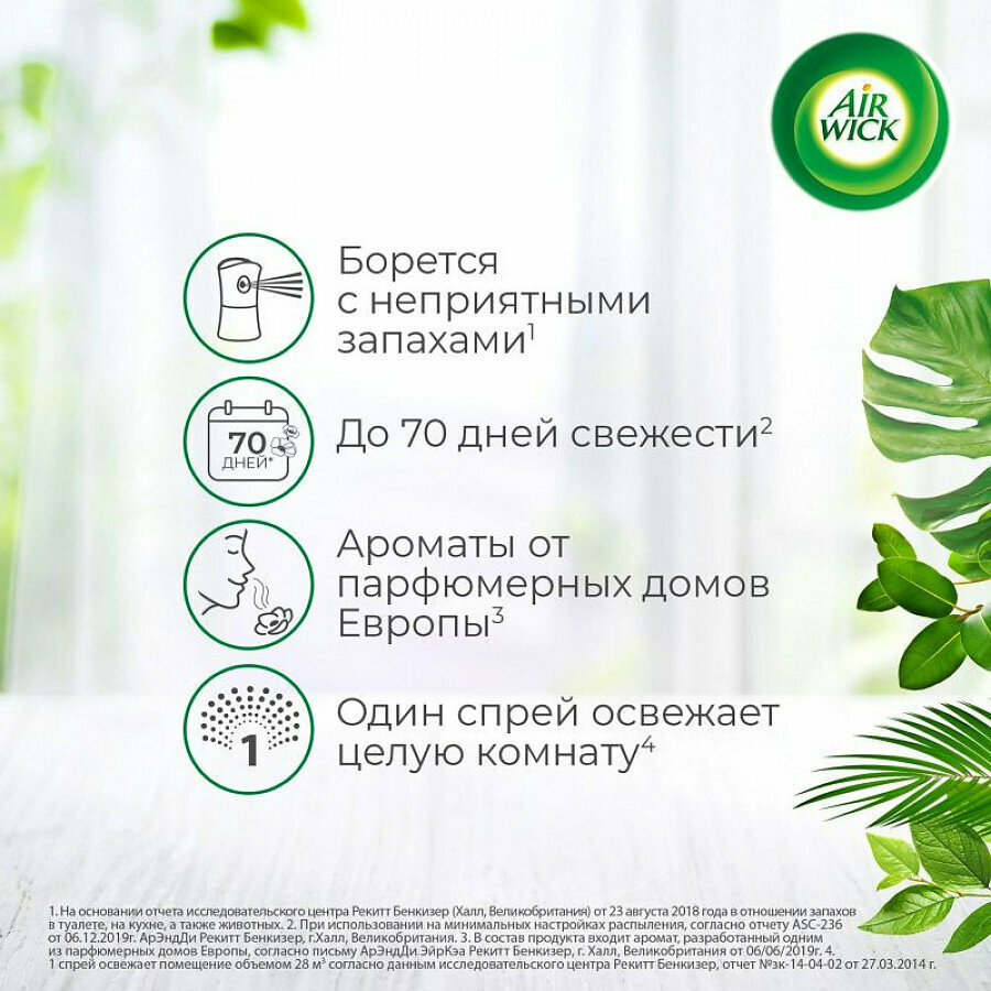 Сменный баллон для автоматического освежителя. Сменный баллон используется в автоматическом диспенсере Air Wick Freshmatic для устранения неприятных запахов и создания комфортной атмосферы с помощью приятных вам ароматов. Освежитель Air Wick можно использовать как у себя дома, так и в офисах, магазинах, ресторанах, общественных зданиях для устранения запахов в туалетных и ванных комнатах, помещениях для курения, кухнях и т. п. Одного аэрозольного спрея Airwick достаточно для поддержания аромата до 70 дней в одной комнате. Точное время использования ароматизатора зависит от настроек интенсивности распыления, установленных на освежителе Air Wick Freshmatic. Дизайн может отличаться. Набор 2 по 250 мл