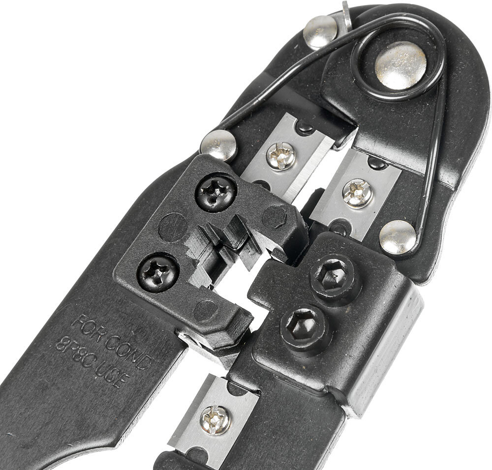 Применяются для опрессовки штекеров RJ-45. Рукоятки клещей покрыты прочными накладками, что обеспечивает удобство в работе и максимально комфортный захват инструмента. Встроенный инструмент для зачистки кабеля и кусачки.