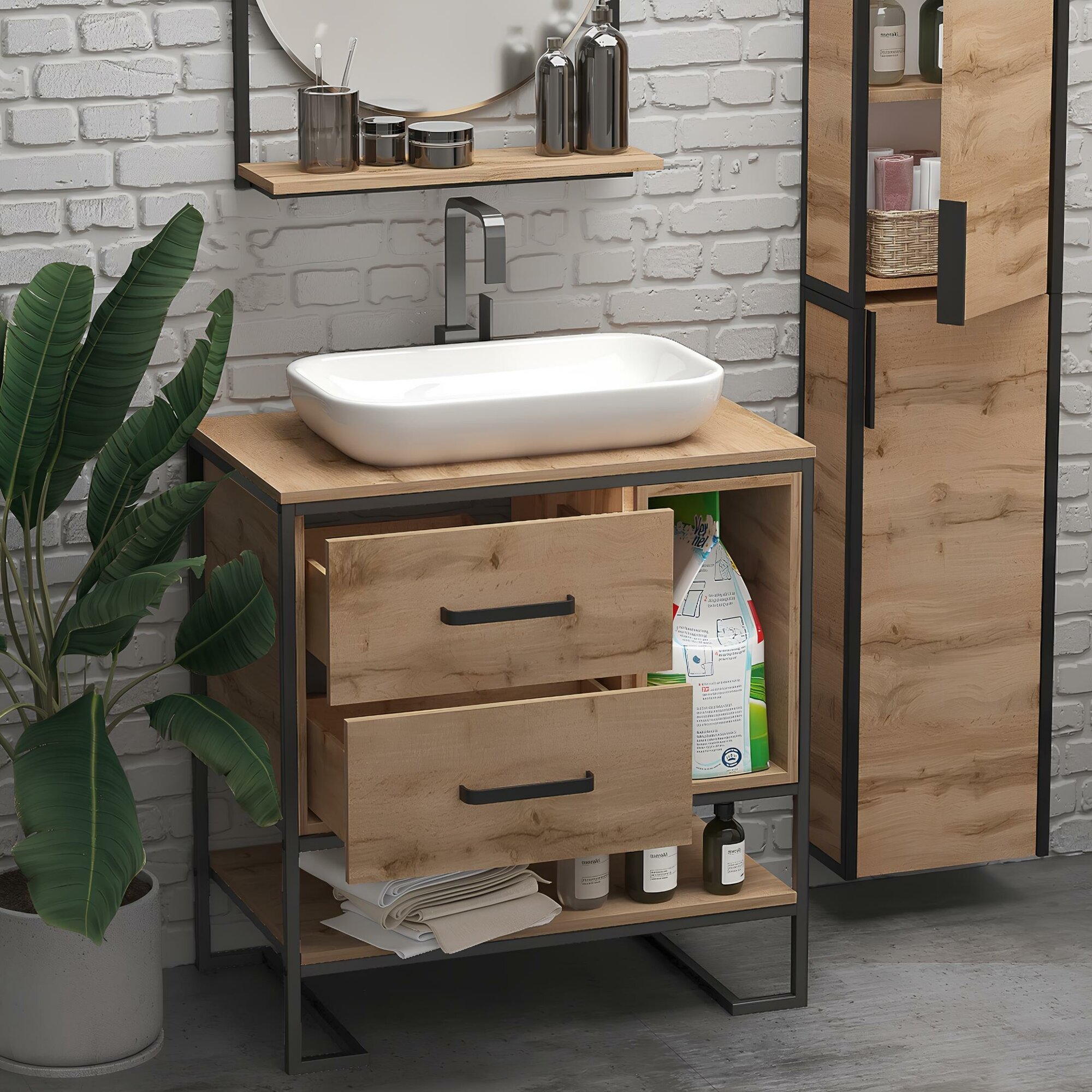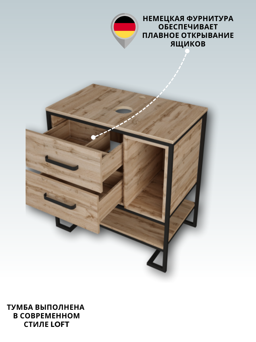 Тумба под раковину 1Marka GRUNGELOFT 80 Ц0000005442 для ванной комнаты, созданная из качественных, устойчивых к воздействию влаги материалов с применением немецкой фурнитуры. В ней собраны все основополагающие тенденции в оформлении мебели для ванных комнат: лаконичные геометрические формы, отсутствие ручки у ящика и его плавное открытие легким нажатием, функциональные кронштейны, которые можно использовать в качестве рейлов, а также разделение ящика на несколько отсеков для большей практичности. Нельзя не отметить и эстетическую ценность модели - она выглядит крайне эффектно, позволяя подчеркнуть индивидуальный стиль ванной комнаты.Преимущества модели:- прочный каркас: металлические навесы выдерживают нагрузку до 130кг; - технология влагозащиты PROTECT: препятствует попаданию влаги, продлевает срок службы;- кронштейны удобно использовать в качестве держателя для полотенец; - надежная немецкая фурнитура: рассчитана на 30 000+ открытий; - фактурная ЛДСП приятна на ощупь, передает ощутимый рельеф материала; - push to open: ящик открывается в одно касание; - трендовый дизайн удачно впишется в современный интрерьер.
