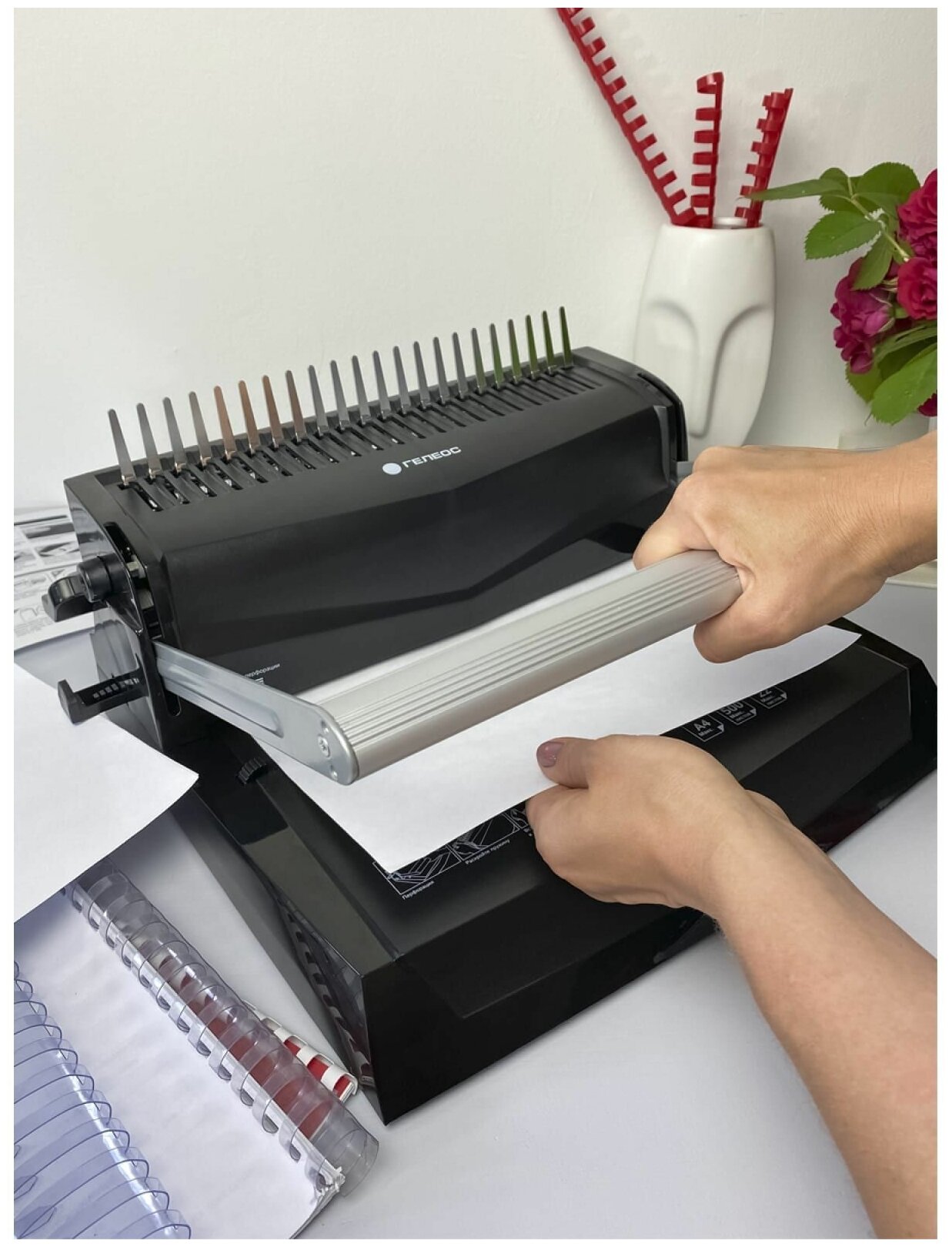 Регулировка глубины перфорации может переплетать как малые (до 100 листов), так и большие объемы бумажных блоков (до 500 листов). Также для удобства перфорации листов имеется ограничитель для бумаги формата А4 и А5.
