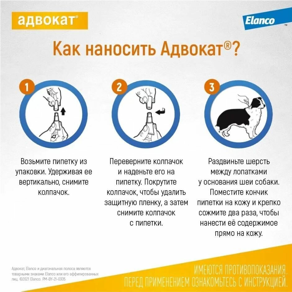 Адвокат® прост в применении – капли наносятся на холку в дозировке согласно весу собаки. Производится в Германии.
