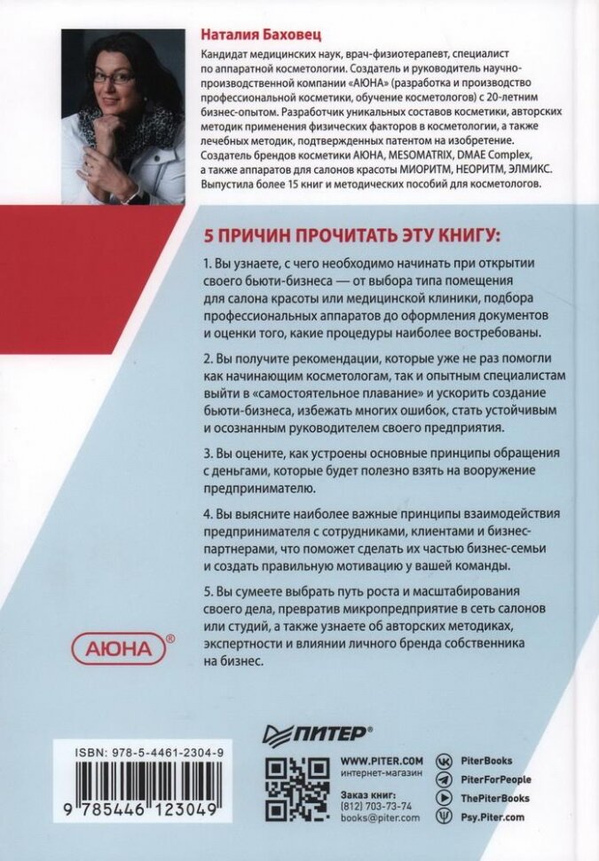 В своей книге Наталия Баховец - успешный предприниматель в области бьюти-индустрии - щедро делится советами и рекомендациями, которые уже не раз помогли как начинающим косметологам, так и опытным специалистам выйти в "самостоятельное плавание" и ускорить создание собственного бизнеса, избежать многих ошибок и стать устойчивым и осознанным руководителем своего предприятия.