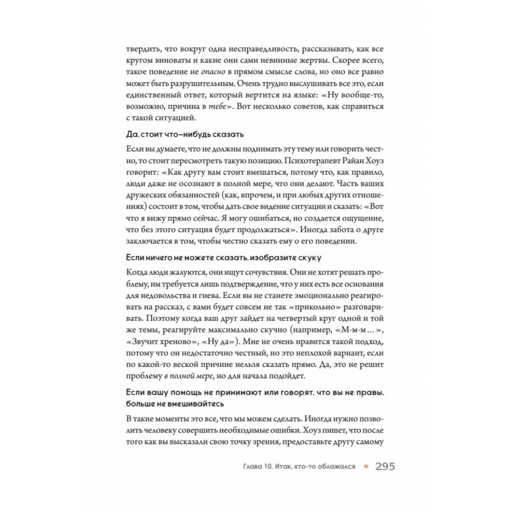 До прочтения этой книги никогда не задумывалась, что дружба начинается с себя. Я часто нахожусь в разногласии с собой, не слышу своих желаний и делаю наперекор чувствам. Не замечала, что это влияет на окружение и дружбу, а ведь с этим у меня тоже не все просто. Каково было моё удивление, когда строчки из книги описывали всю мою ситуацию, я ещё не прочитала книгу полностью, но уже могу сказать, что многое осознала для себя