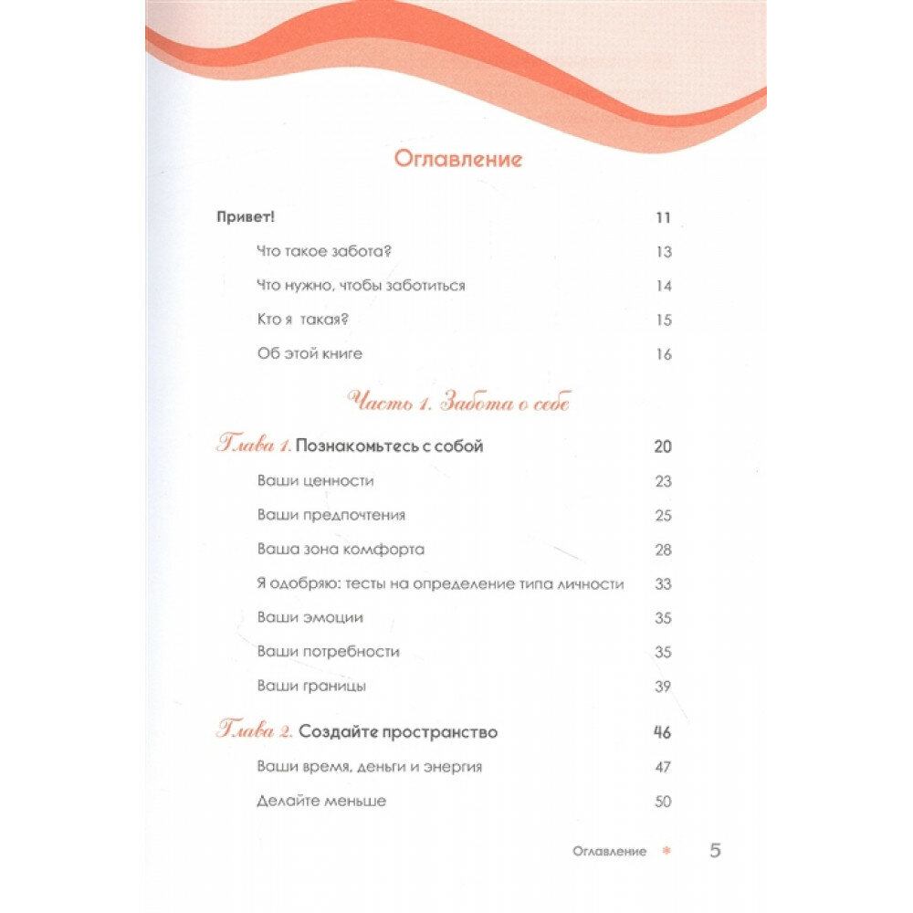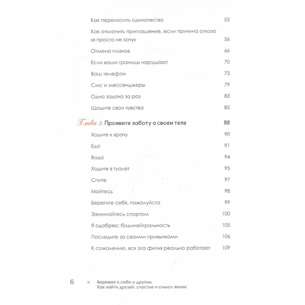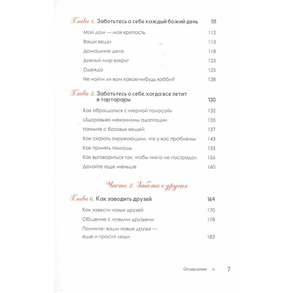 Книга разделена на две части, сначала о заботе о себе, а потом о других. Это не просто так, поскольку, если вы не поймете своих нужды и не научитесь взаимодействовать с собой, заботиться о себе и ощущать свои личные границы, то и не сможете сделать все то же по отношению к другим. Мне понравилось, что автор начал со знакомства читателя с ним же самим, в этом деле нет определенных рамок, у каждого человека разный уровень нужды в социализации и общении, есть интроверты, а есть экстраверты, так же есть разные уровни ментальной энергии и разные типы личности, кроме того не забудем и о разных языках любви, и для того, чтобы показать человеку, что вы его любите порой недостаточно поступать так, как вы бы хотели, чтобы поступали по отношению к вам, но это уже ко второй части. В таких книгах первый шаг - знакомство с собой, самый любимый и самый важный, потому что он является фундаментом, на который потом проще строить все остальное, а так же и отношения с другими людьми. Во второй главе отдельное внимание отдам главе 9 "когда у друга черная полоса", потому что этот тот сложный момент, когда мы действительно хотим помочь, но по итогу можем сделать только хуже, это необходимо разобрать всем. -