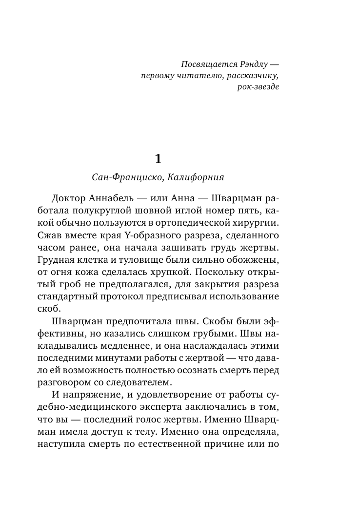Доктор Анна Шварцман – блестящий судебно-медицинский эксперт департамента полиции Сан-Франциско. Ее работа – выяснять правду о последних мгновениях жизни потерпевших, которую мертвые уже не расскажут сами.