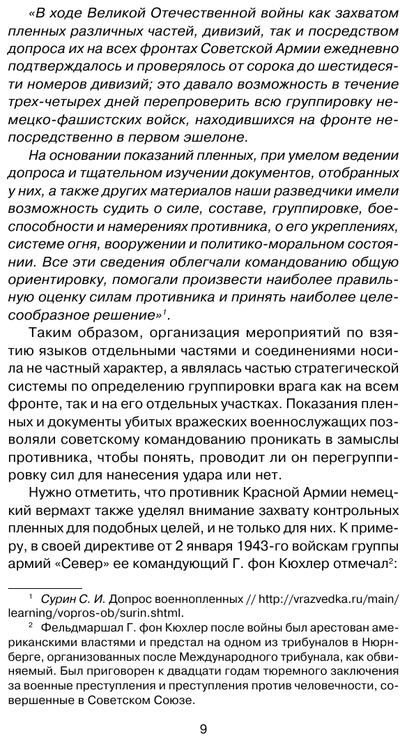Автор начинает свое изложение с анализа состояния нашей разведки, данной в декабре 1940 г. на совещании высшего руководства РККА, где было заявлено, что она находится в плачевном состоянии. В. А. Нагирняк убедительно показывает, что навеянный книгами, фильмами и сериале о Великой Отечественной стереотипный образ разведчика – опытные и смелые бойцы в маскхалатах, уверенно добывавшие «языков» - справедлив лишь для последних лет войны. Начало же Великой Отечественной застало нашу фронтовую разведку без должного опыта и грамотных кадров, не умеющей грамотно планировать разведакции. Отсюда отсутствие результата и большие потери. Эта ситуация менялась, но медленно. Скажем, в своем докладе Верховному Главнокомандующему о состоянии дел на Западном фронте к апрелю 1944 г. комиссия ГКО подчеркнула, что на одного захваченного пленного приходится до пяти погибших разведчиков…