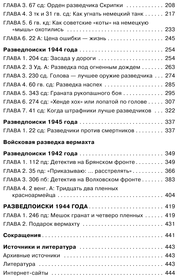 Состоит из двух неравных частей: войсковая разведка РККА (шесть разделов объемом в 335 стр.) и войсковая разведка вермахта (два раздела, 90 стр.). Есть небольшое введение, но нет заключения.