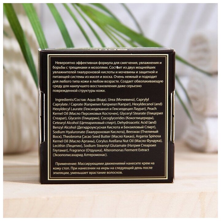 Невероятно эффективная формула для смягчения, увлажнения и борьбы с трещинами и мозолями. Состоит из двух мощнейших увлажнителей гиалуроновой кислоты и мочевины и защитной и питающей системы из масел и воска. Очень нежный и подходит для любого типа кожи в любом возрасте. Создает обволакивающую среду для наилучшего восстановления даже серьезно поврежденной структуры кожи. Способ применения: Массирующими движениями нанесите крем на кожу стоп. При нанесении на икры на следующий день после эпиляции, уменьшает врастание волосков. Состав: Aqua (Вода), Urea (Мочевина), Caprylyl Caprylate / Caprate (Каприлил Каприлат/Капрат), Hexyldecanol (and) Hexyldecyl Laurate (Гексилдеканол и Гексилдецил Лаурат), Peach Kernel Oil (Масло Персиковых Косточек), Glyceryl Stearate (Глицерил Стеарат), Glycerin (Глицерин), Cocoglycerides (Кокоглицериды), Cetearyl Alcohol (Цетеариловый спирт), Dehydroacetic Acid (and) Benzyl Alcohol (Дегидроуксусная Кислота и Бензиловый Спирт), Sodium Hyaluronate (Гиалуроновая Кислота), Beeswax (Пчелиный Воск), Theobroma Cacao Seed Butter (Масло Какао), Argania Spinosa Kernel Oil (Масло Арганы), Corylus Avellana Nut Oil (Масло Фундука), Lecithin (Лецитин), Sodium Stearoyl Glutamate (Натрия Стеароил Глутамат), Fragrance (Отдушка), Alteromonas Ferment Extract (Экзополисахарид Алтеромонас).