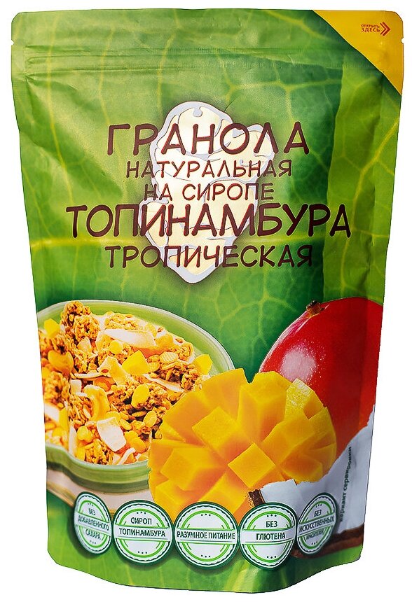 | Состав | Хлопья запеченные овсяные, манго сушеный, кокосовые чипсы, кешью, сироп топинамбура (топинамбур, вода), масло кокосовое, семена чиа, корица молотая,соль морская. |