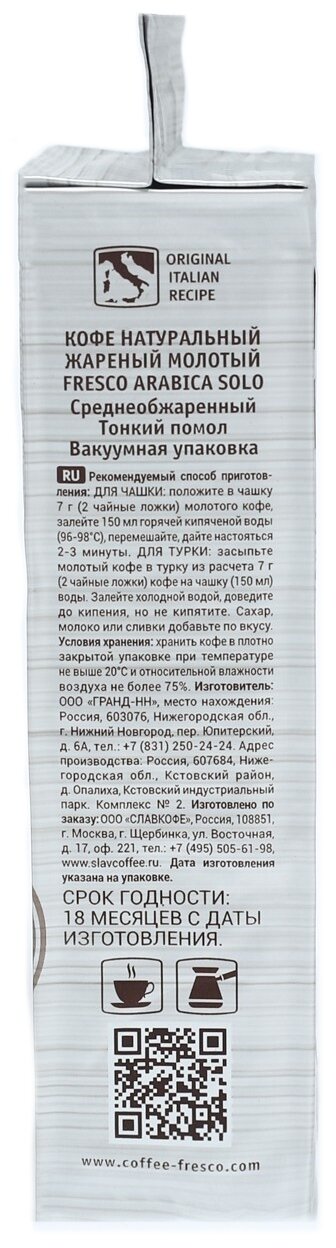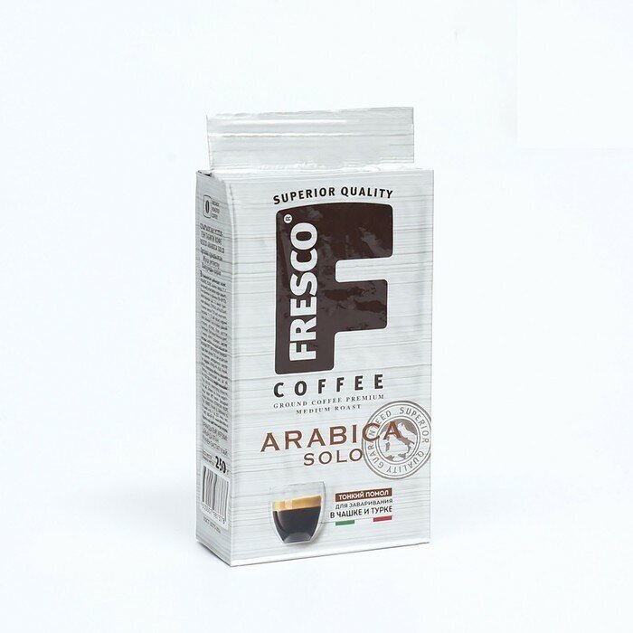 Кофе FRESCO Arabica Solo молотый для чашки и турки – смесь сортов арабики из Южной Америки средней обжарки и тонкого помола.Blend №7.Напиток обладает насыщенным вкусом с небольшой кислинкой. Это идеальный напиток для тех, кто предпочитает классический сбалансированный кофе.
