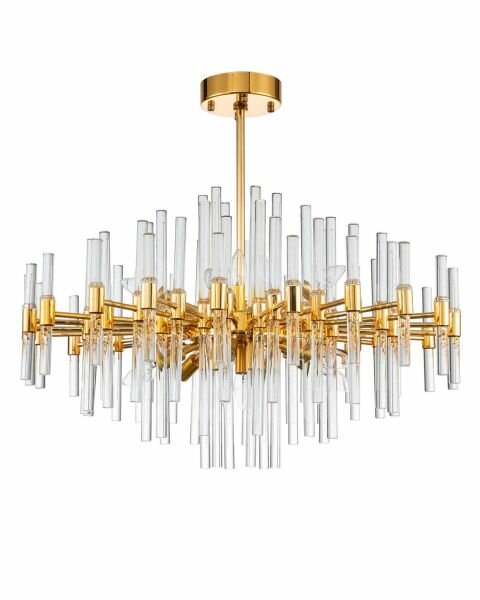 Стильная подвесная люстра на штанге. Металлический каркас золотого цвета декорирован вставками из прозрачного хрусталя, которые создают красивые блики на поверхности, преломляя свет. Изящный дизайн люстры поможет разнообразить интерьер комнаты. Площадь освещения 22 м².