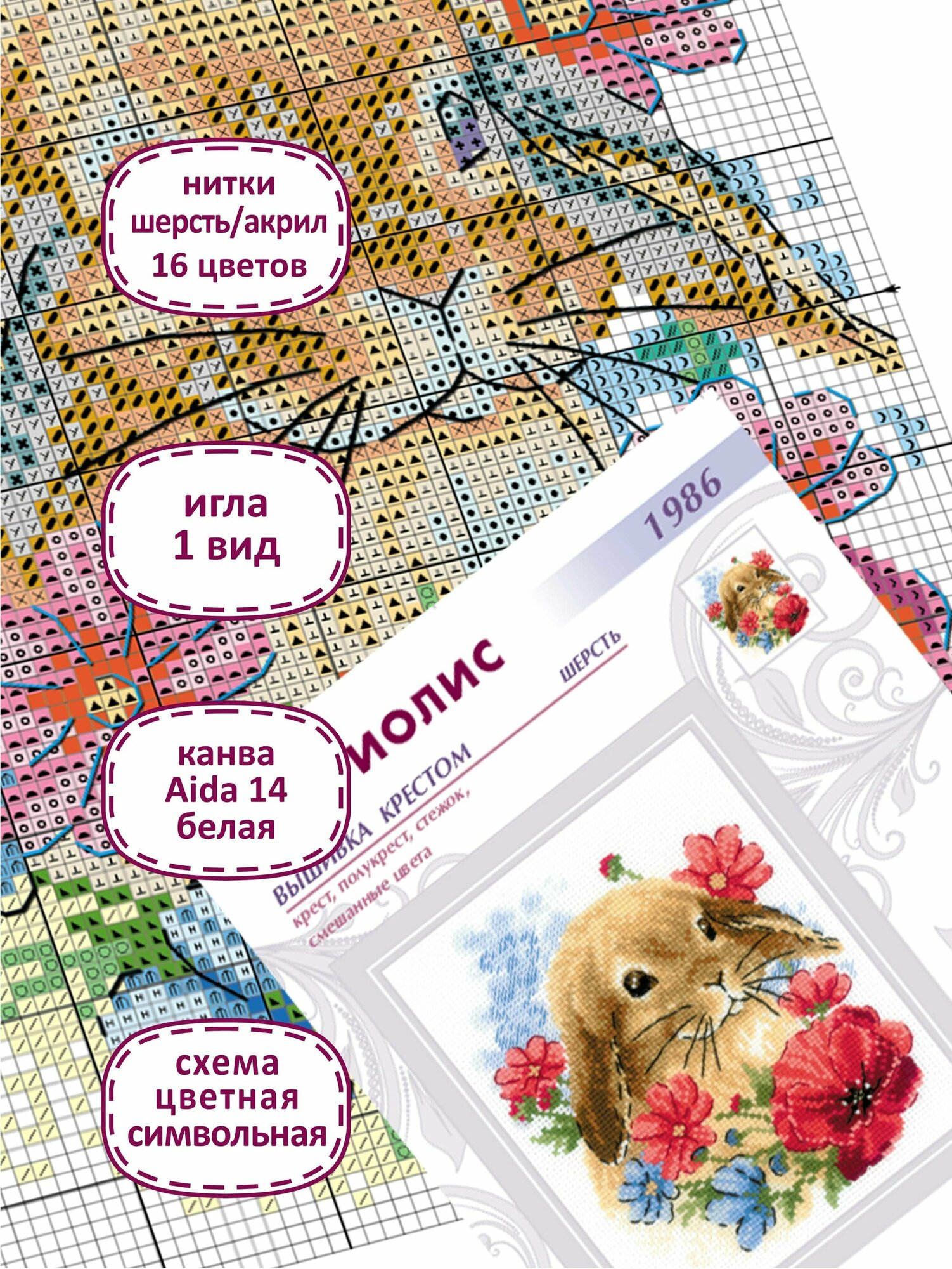 В наборе: канва Aida 14 Zweigart белая, нитки мулине шерсть/акрил, игла, цветная символьная схема, инструкция.