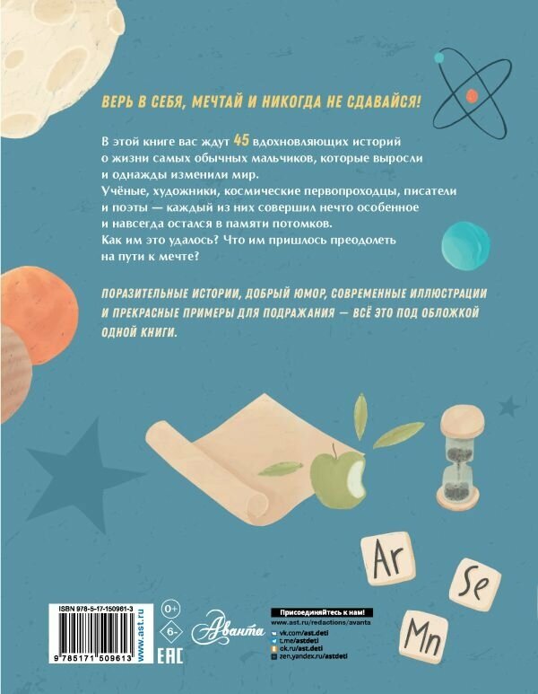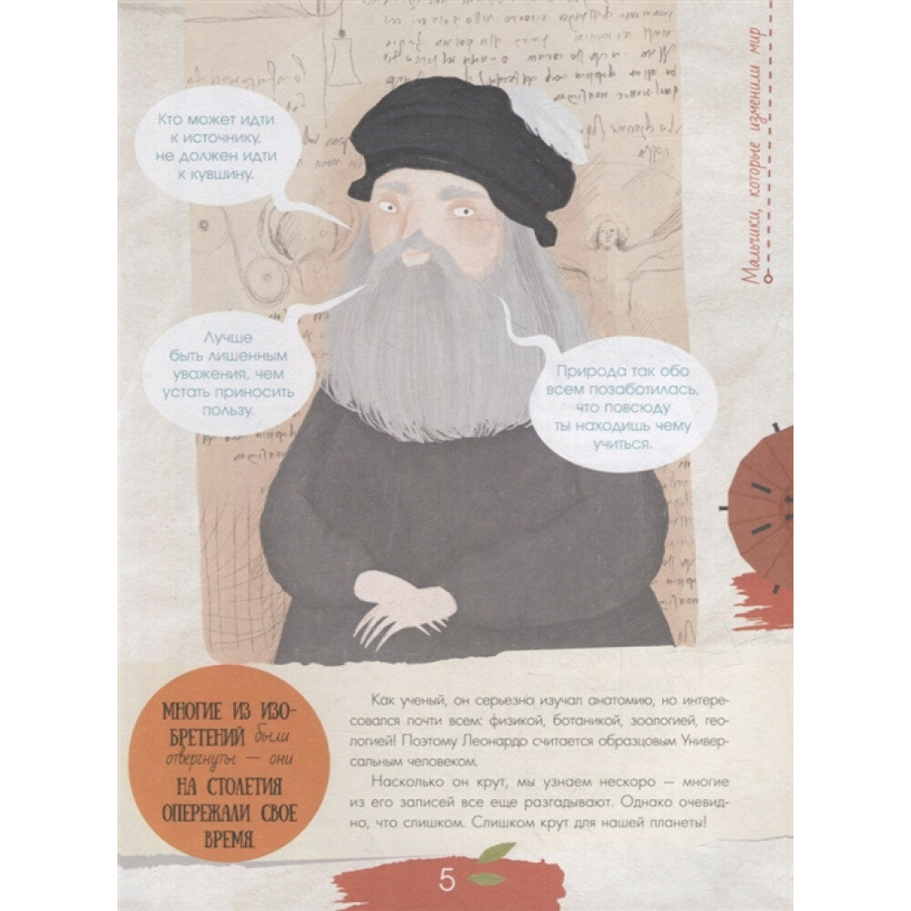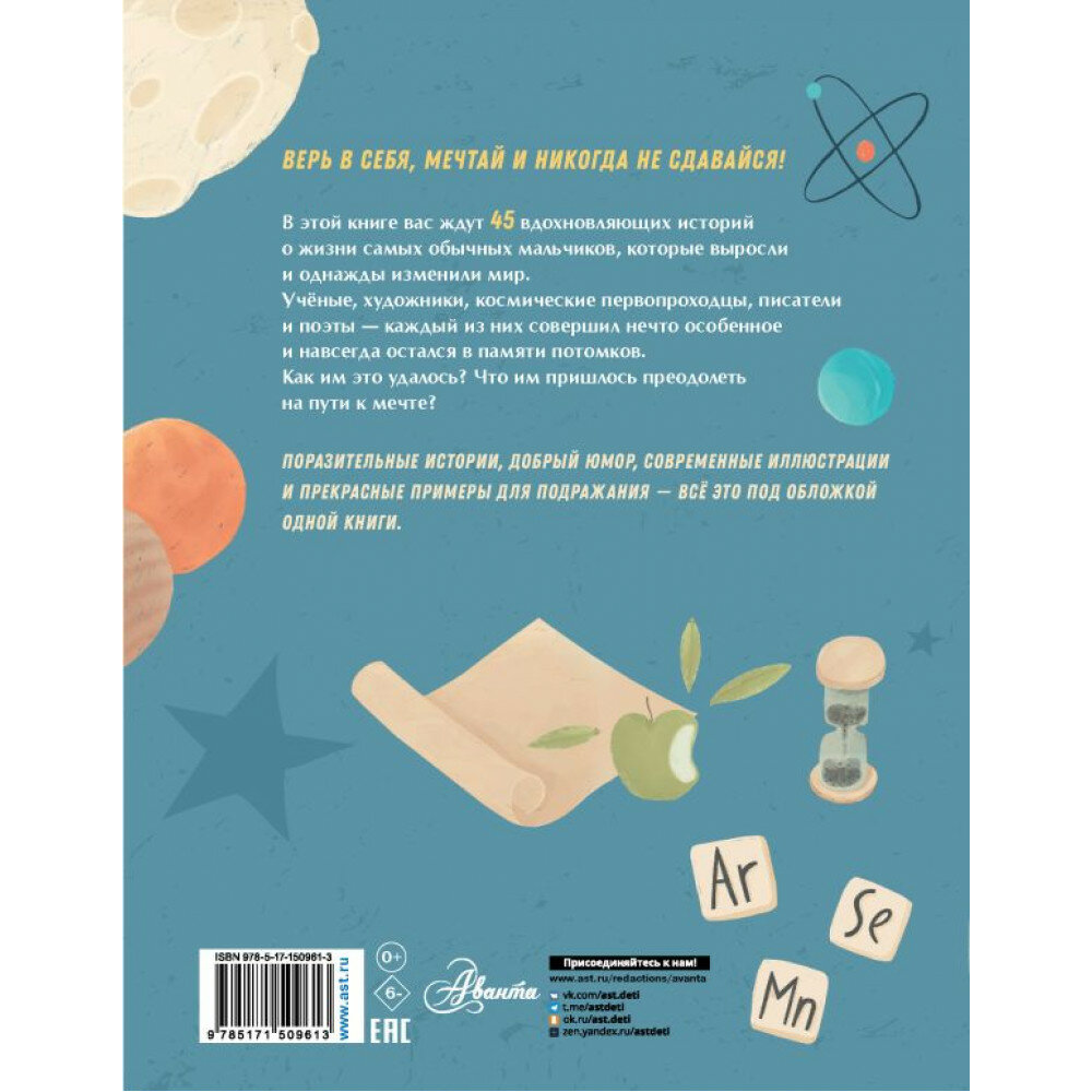 Под обложкой книги "Мальчики, которые изменили мир" читателей ждет 45 вдохновляющих историй о жизни известных мужчин. Ученые, писатели и поэты, художники, режиссеры и космические первопроходцы - все они когда-то были детьми и шли за своей мечтой. И каждый из них однажды стал первым в том или ином деле, совершил прорыв и остался в памяти потомков.
