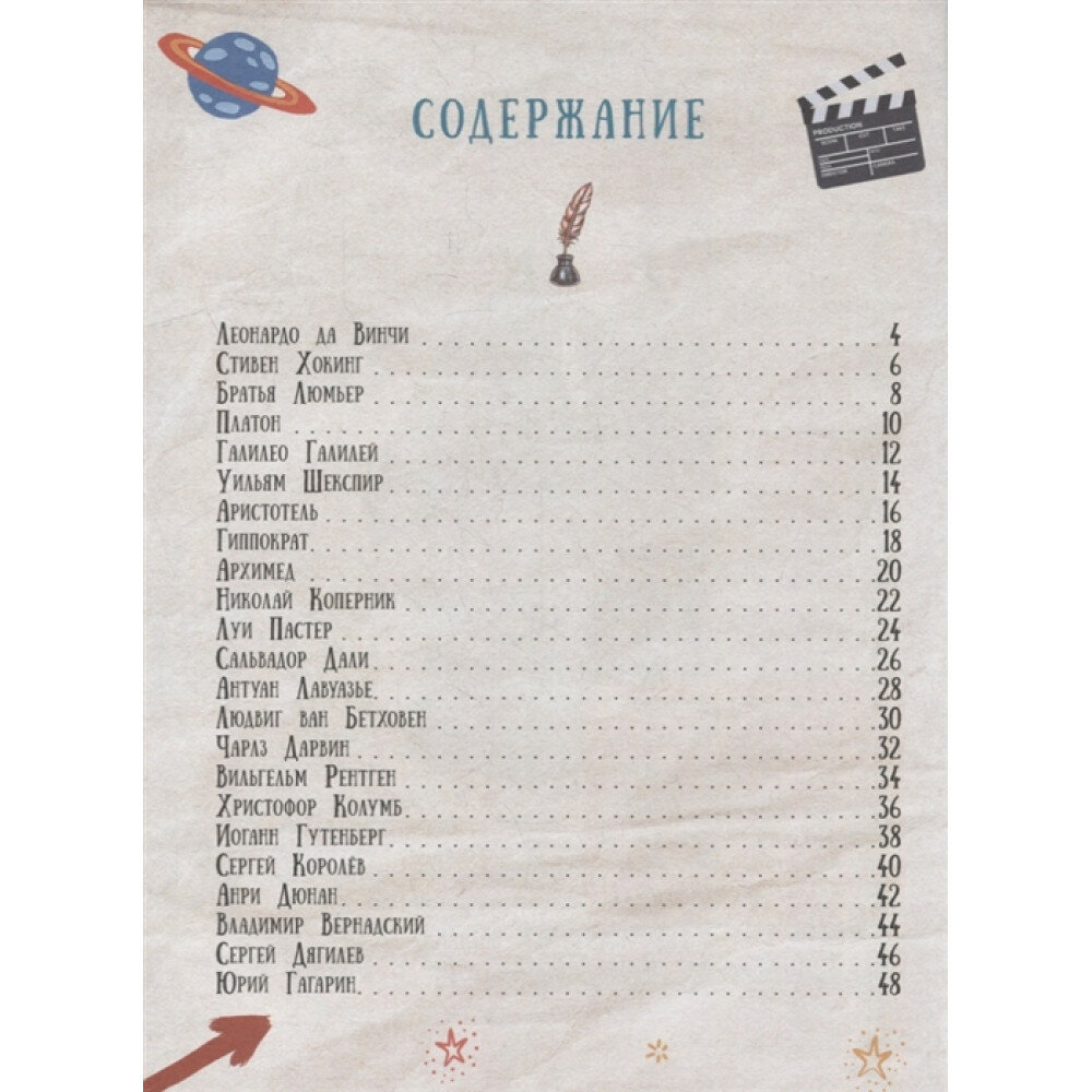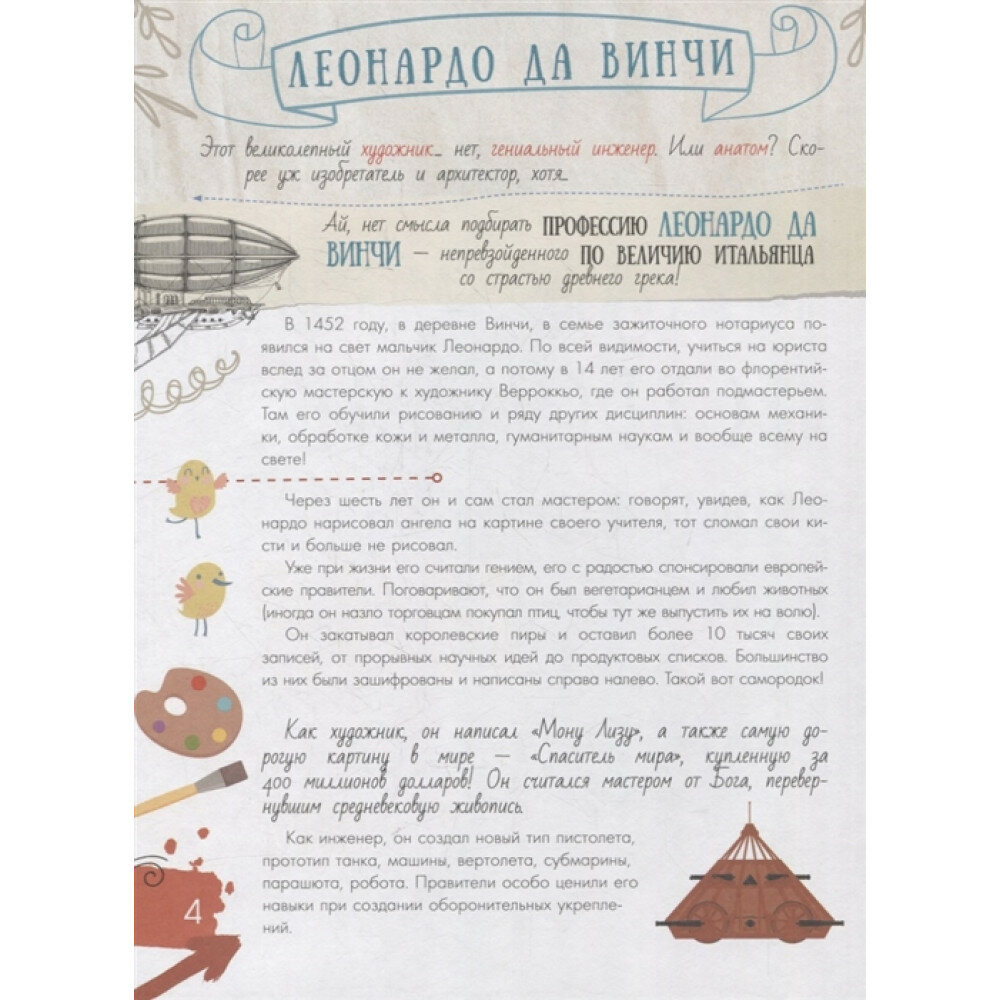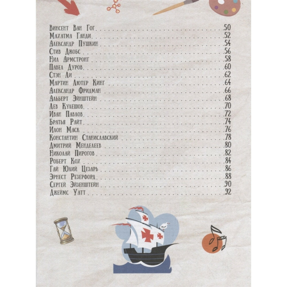 Купила сыну эту книгу и она ему очень понравилась. Очень необычное оформление и подача информации. Никакого занудства, а в очень доступной форме, даже с юмором, я бы сказала преподнесена информация. Каждый разворот отдельная история про человека. Тут собраны люди, которые оказали влияние в той или иной степени на развитие науки, культуры, политики. Много информации мы не знали и книга стала поучительной и для взрослых. Очень необычные иллюстрации. Вообщем, эта книга очень заинтересовала ребенка и он каждый вечер читал по несколько историй.
