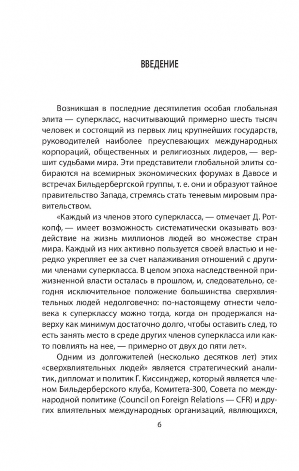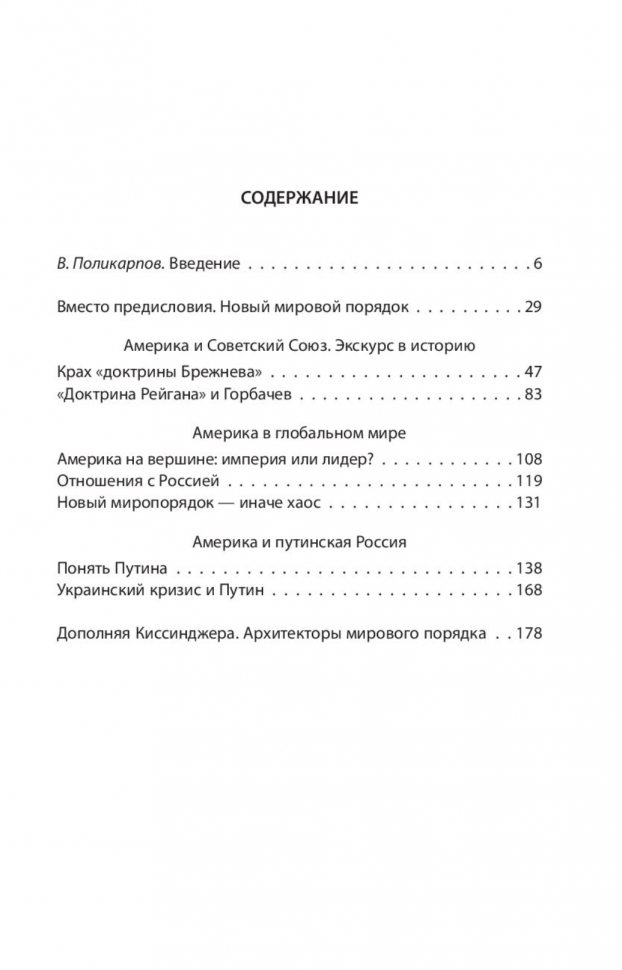 В магазине , в отделе мемуаров и автобиография увидел данную книгу и стало интересно прочитать о чем пишет Генри Киссинджер. При прочтении оказалось , что никакое отношение он к этой книге и не имеет. Отдельные выдержки из интервью различным газетам и телевидениям коих хорошо если на 40 страниц наберется в книге тоже считаю не состоятельные, потому что если переводить интервью , то переводить полностью, а не брать кусками. Чего хотели донести авторы, а Захарова и Львов именно авторы, а не переводчики, не понятно. При чем тут в книге Катасонов тоже не понятно. При желании можно разобрать всю книгу и дать полную характеристику, но не хочется даже тратить время. Не понравилась! Впредь буду обращать внимание при покупке книг на писателей, «переводчиков» и издательство