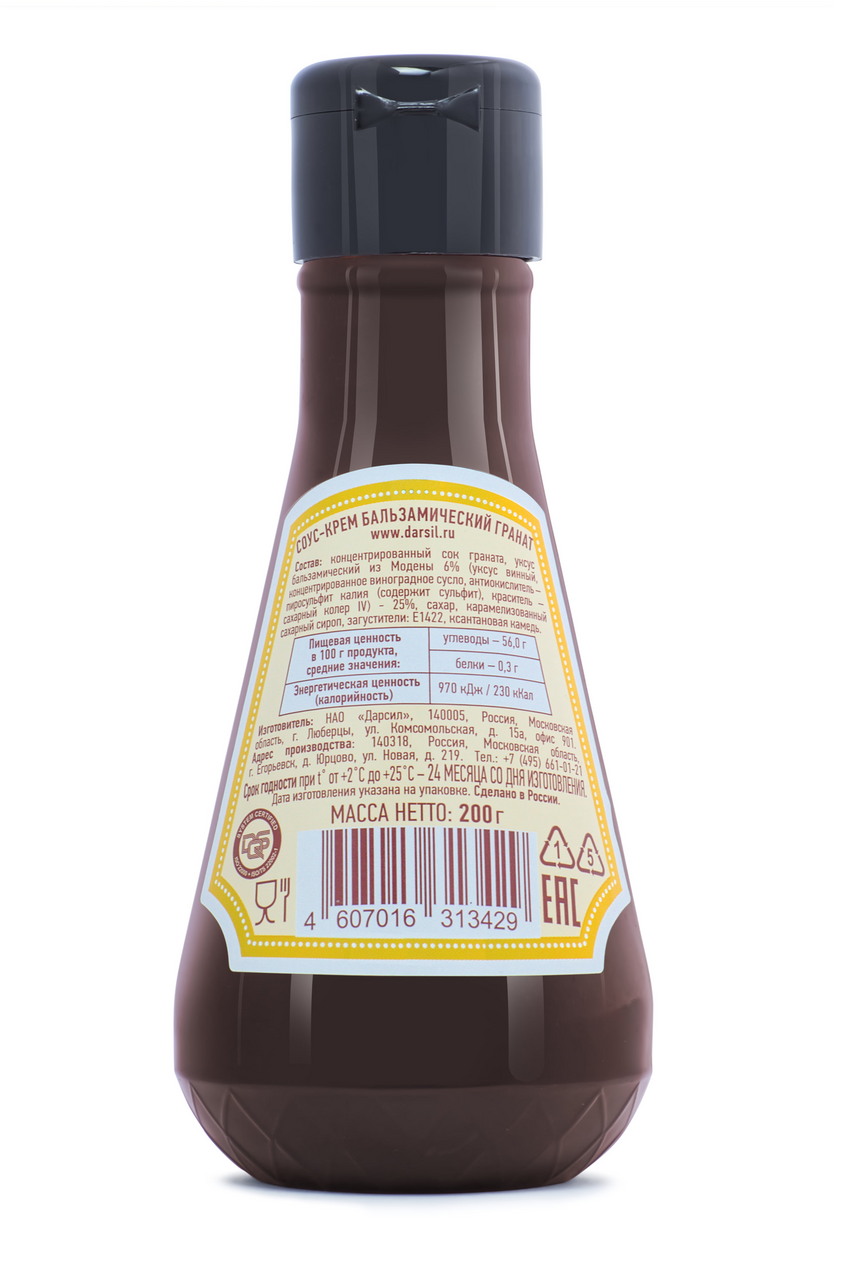 | Состав | концентрированный сок граната,уксус бальзамический из модены 25 % (уксус винный,концентрированное виноградное сусло,антиокислитель пиросульфит калия (содержит сульфит),краситель сахарный колер IV),сахар,карамелизованный сахарный сироп,загустители (E1422,ксантановая камедь) |