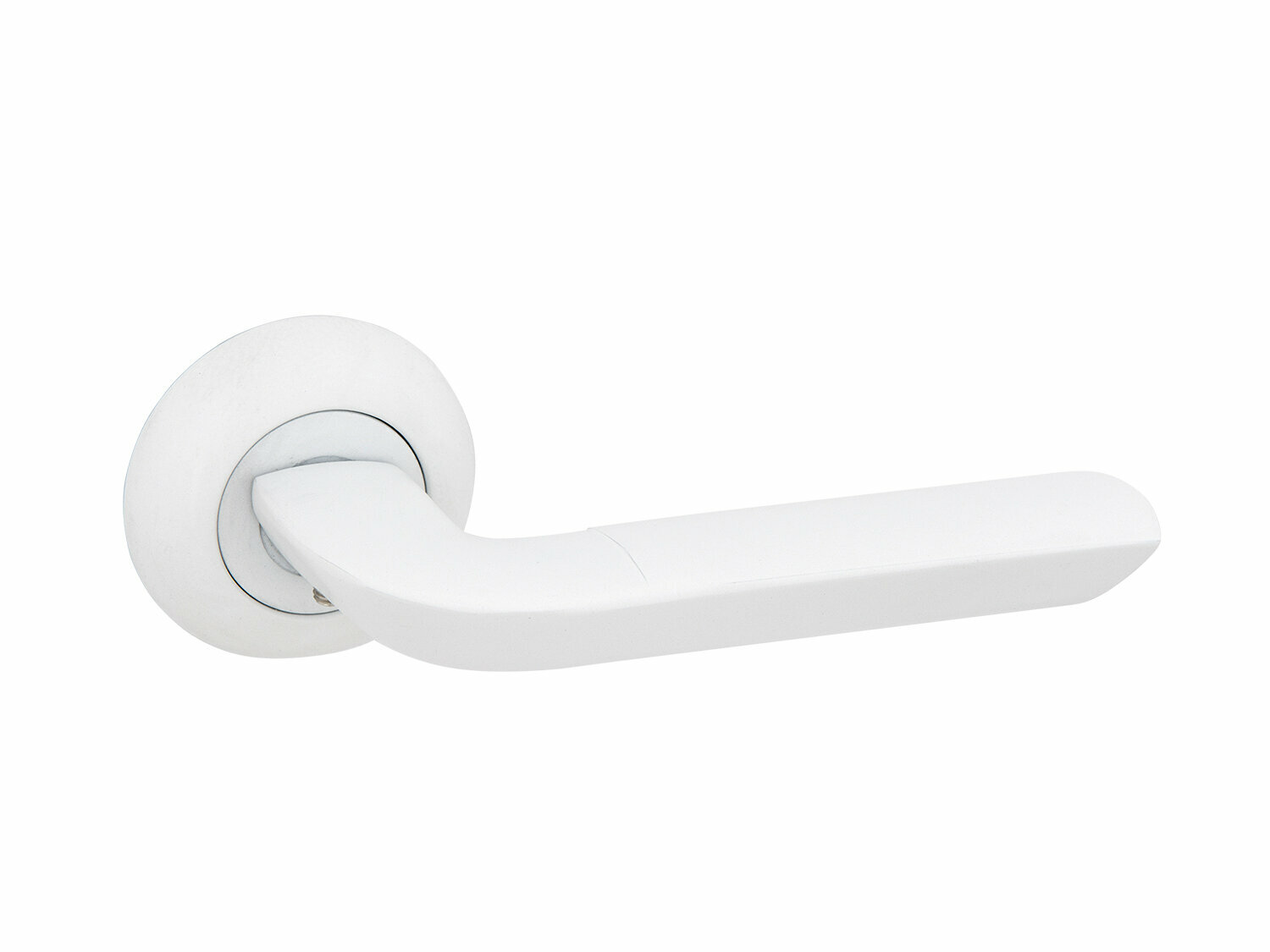 Белая дверная ручка на круглой розетке Avvio из коллекции «Фабрики замков» Tecnologia. Предназначена для межкомнатных и входных дверей – как левых, так и правых.