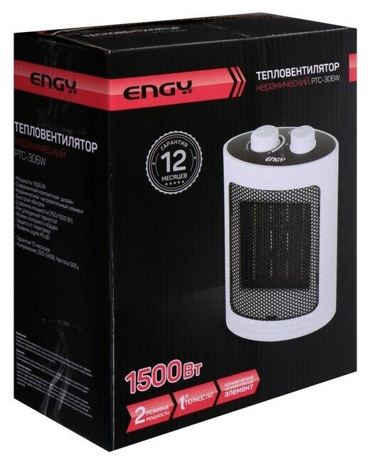 Тепловентилятор Engy PTC-306W 005597 имеет мощность 1500 Вт. Технология автоматического отключения при опрокидывании и защита от перегревания мотора позволит долгое время пользоваться устройством и не даст случиться пожарам.
