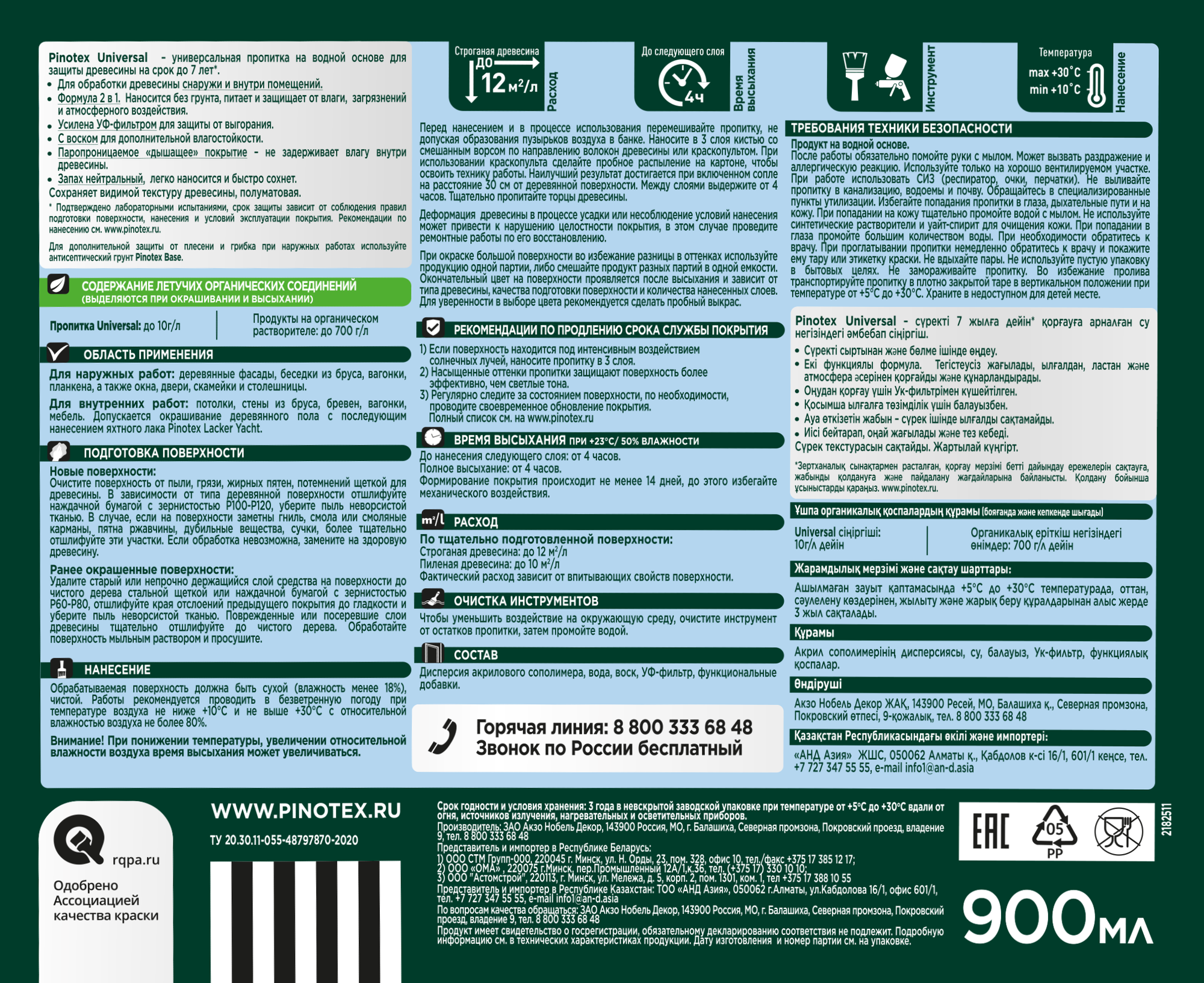 быстро сохнет. Низкое содержание ЛОС (Летучие Органические Соединения) до 10г/л. Сохраняет видимой текстуру древесины, полу- матовая. Для дополнительной защиты от плесени и грибка при наружных работах используйте антисептический грунт Pinotex Base.