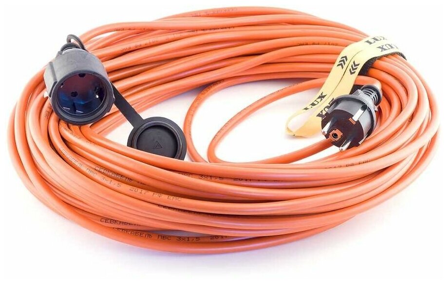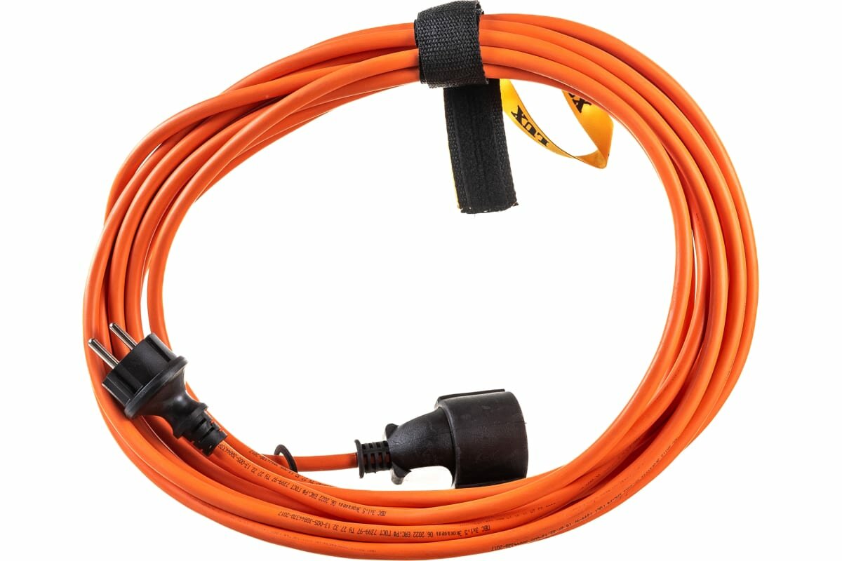 Удлинитель изготовлен из провода ПВС сечением 3х0,75, имеет пластиковую выносную вилку с заземлением, общая длина провода 10 метров. Максимальный ток 10А, максимальная мощность подключаемых потребителей 2200 Вт при полностью размотанном кабеле.