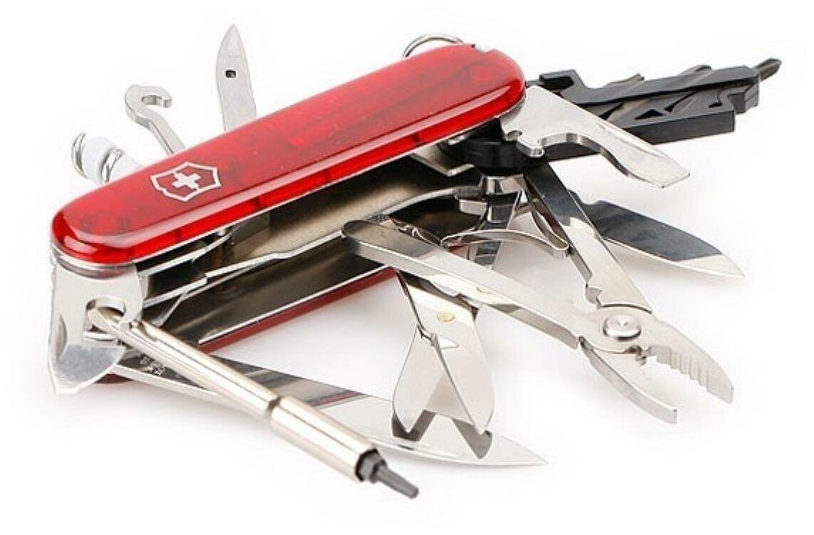 | Инструменты (функции) | большое лезвие малое лезвие штопор консервный нож малая отвертка открывалка для бутылок отвертка инструмент для снятия изоляции шило (кернер) кольцо для ключей пинцет зубочистка ушко для шитья шариковая ручка инструмент для переключения DIP-переключателей булавка мини-отвертка плоскогубцы кусачки для провода инструмент для обжима провода ножницы универсальный крючок ключ гнездо для шестигранников 5 мм, для D-SUB гнездо для шестигранников 4 мм, для бит насадка Pozidrive 0 насадка Pozidrive 1 насадка Slotted 4 мм насадка Philips 2 насадка Hex 4мм насадка Torx 8 насадка Torx 10 насадка Torx 15 пластиковый держатель насадок |