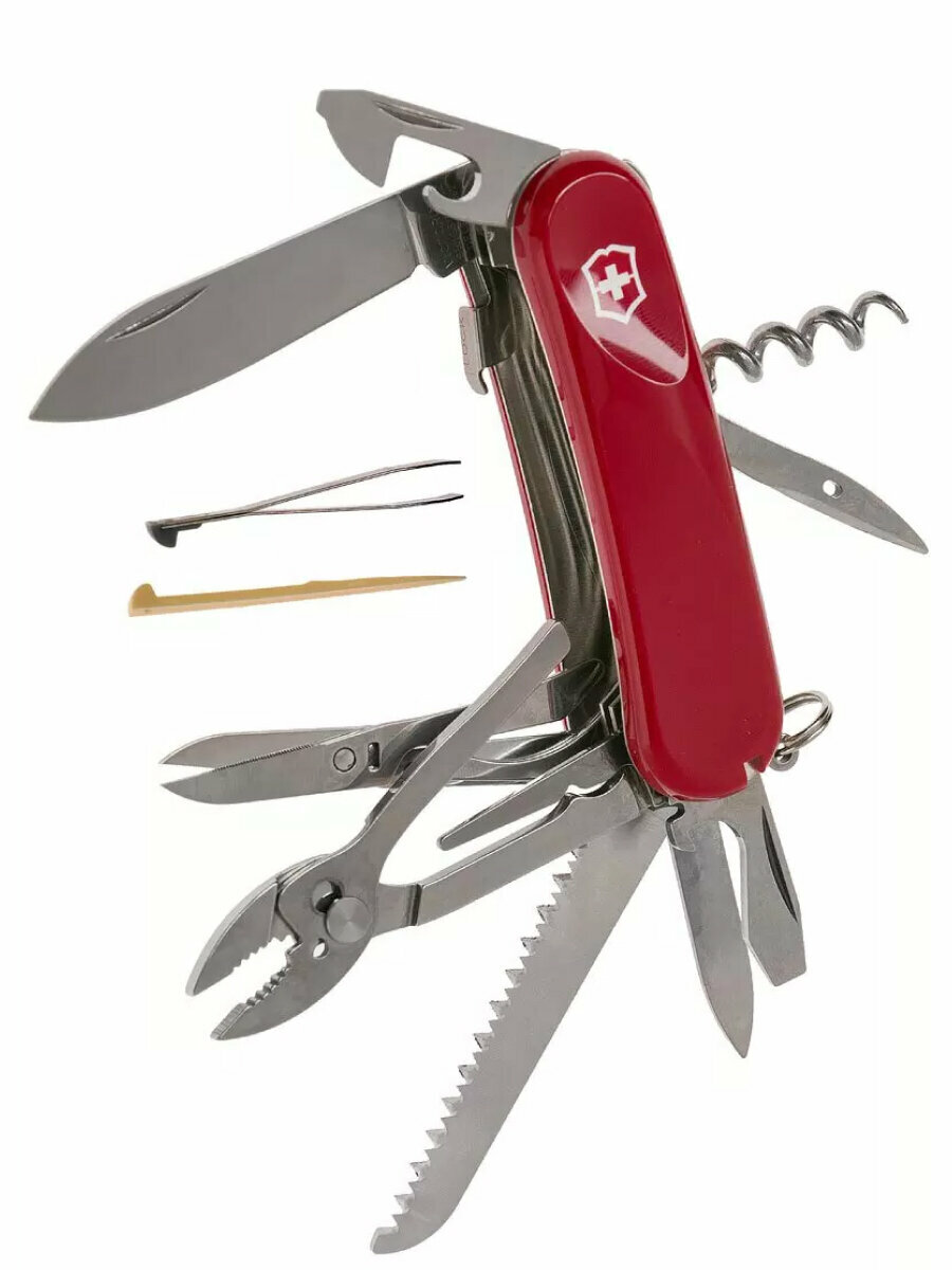 | Инструменты (функции) | лезвие с системой блокировки открывалка для консервных банок отвертка 3 мм открывалка для бутылок плоская отвёртка с системой блокировки приспособление для зачистки проводов пилка для ногтей инструмент для ухода за ногтями шило штопор гаечный ключ гайковерт обжимные щипцы двухпозиционные плоскогубцы внешние и внутренние кусачки для проволоки универсальный ключ ножницы с микроволнистой кромкой лезвий зубочистка пинцет кольцо для ключей |
