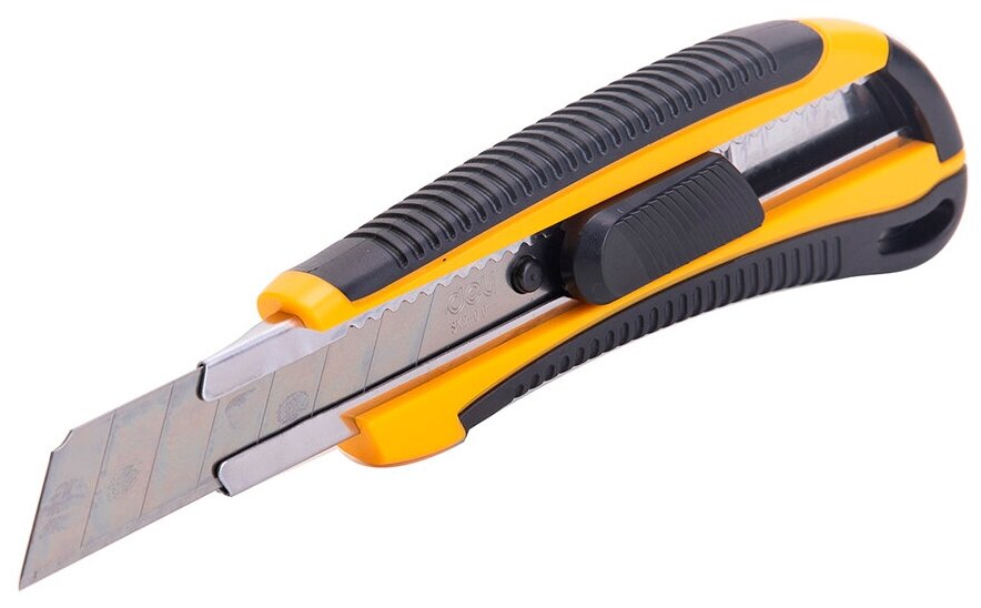 Канцелярский усиленный нож с шириной лезвия 18мм, толщина стали 0,6мм, прорезиненная рукоять, упаковка - блистер, цвета в ассортименте: голубой, желтый.