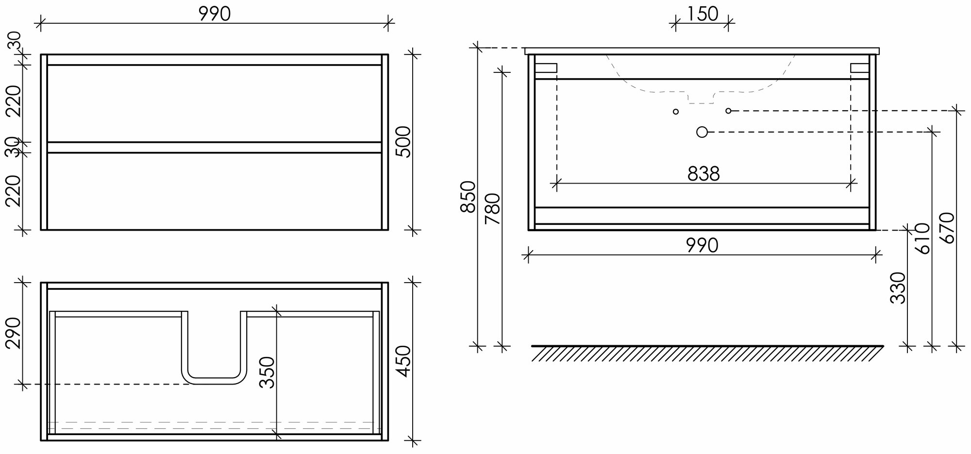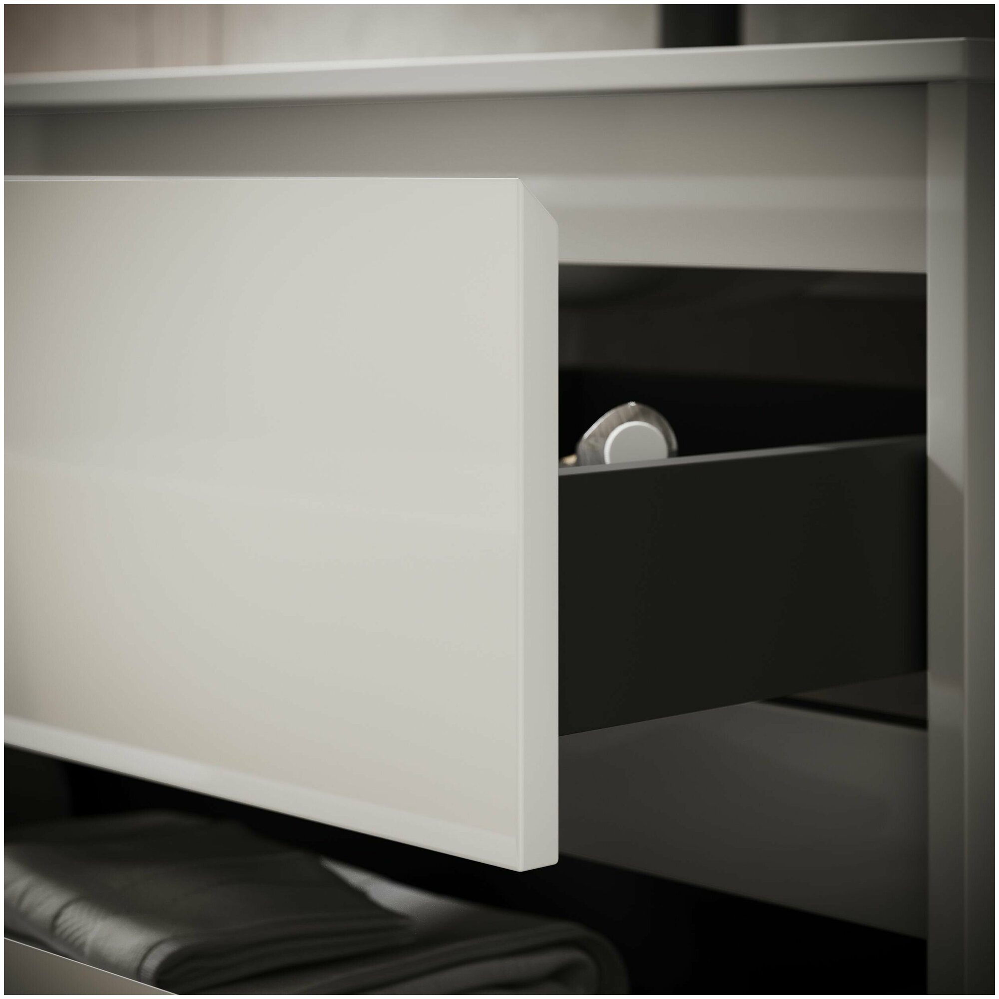 | Дополнительная информация | С двумя ящиками оснащенными доводчиками скрытого монтажа с системой Soft close (плавного закрывания), c фрезерованными ручками по всей длине фасада. |