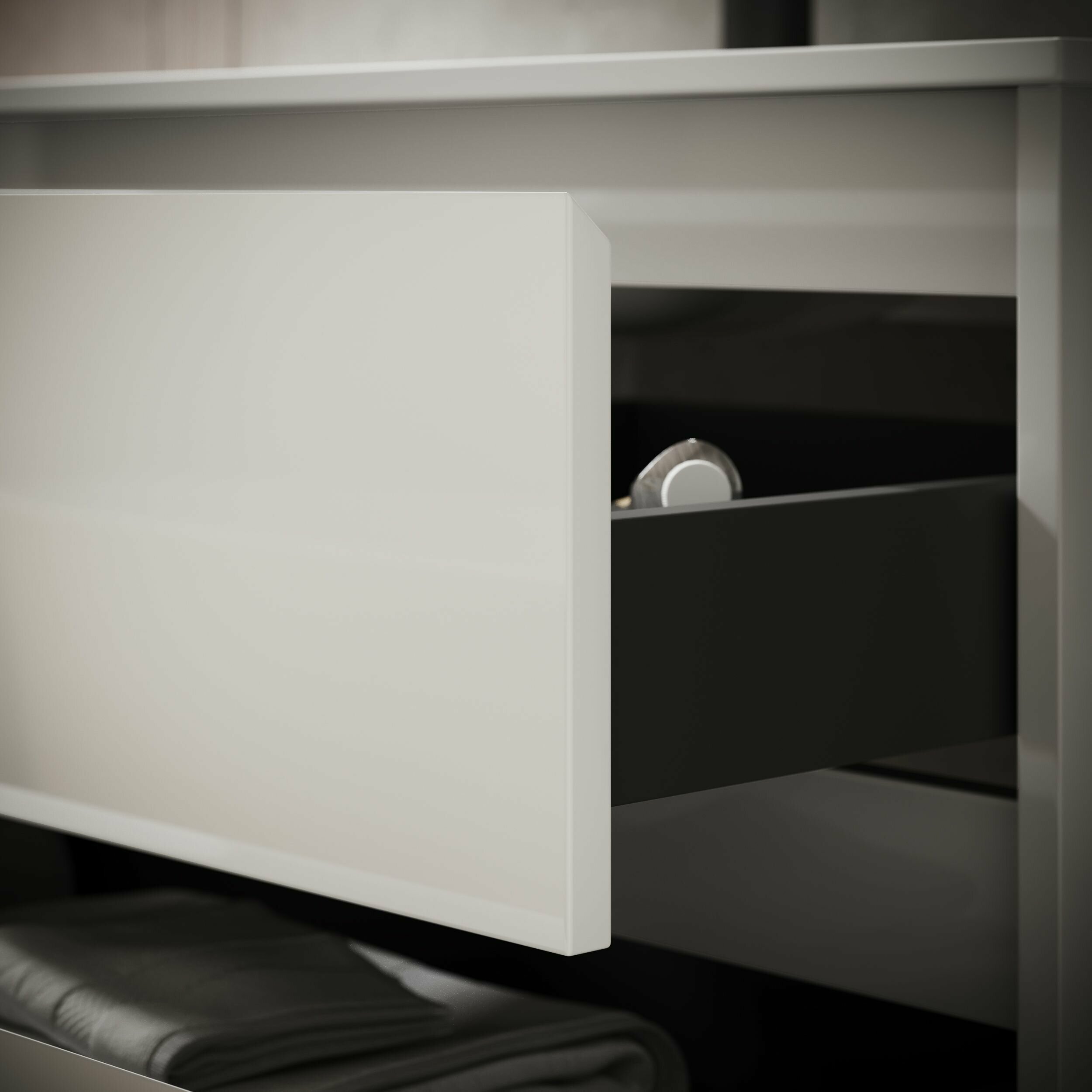 | Дополнительная информация | С двумя ящиками оснащенными доводчиками скрытого монтажа с системой Soft close (плавного закрывания), c фрезерованными ручками по всей длине фасада. |