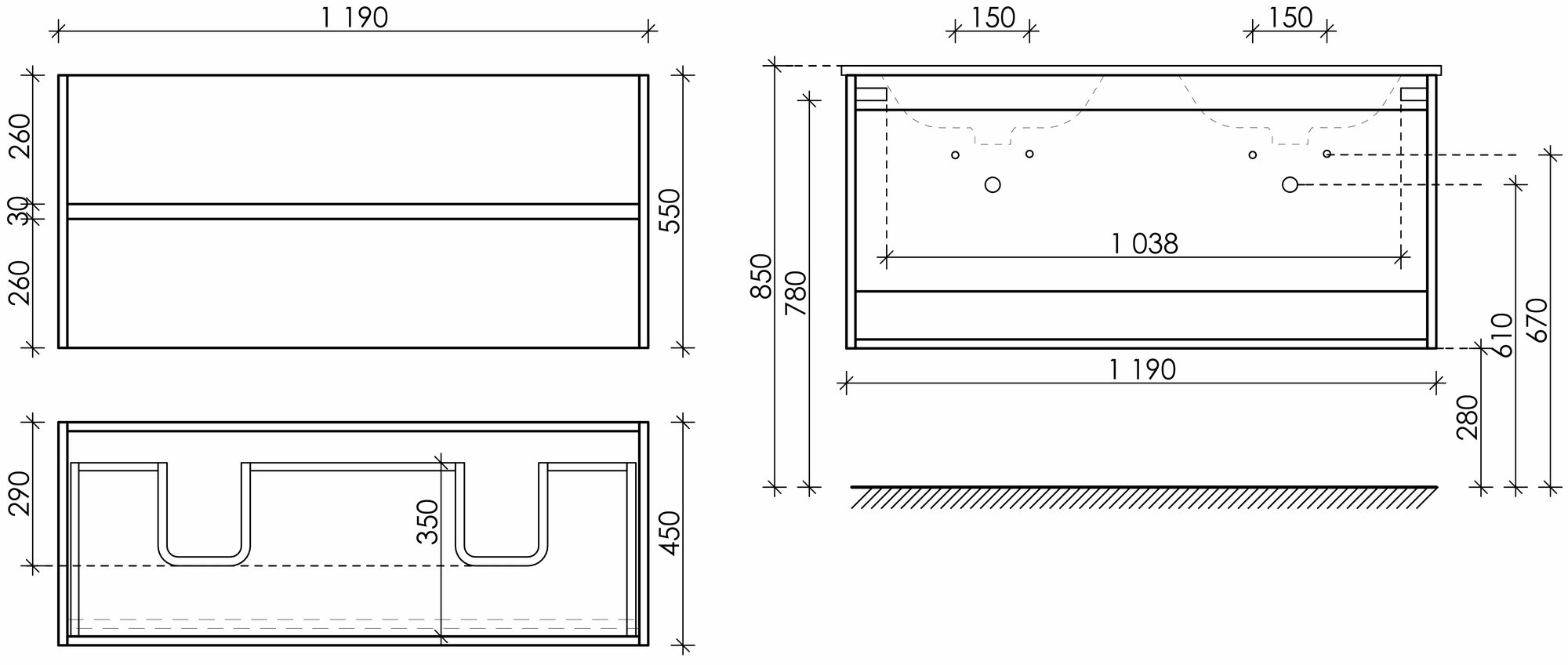 | Дополнительная информация | С двумя ящиками оснащенными доводчиками скрытого монтажа с системой Soft close (плавного закрывания), cручкой Gola по всей длине тумбы. |