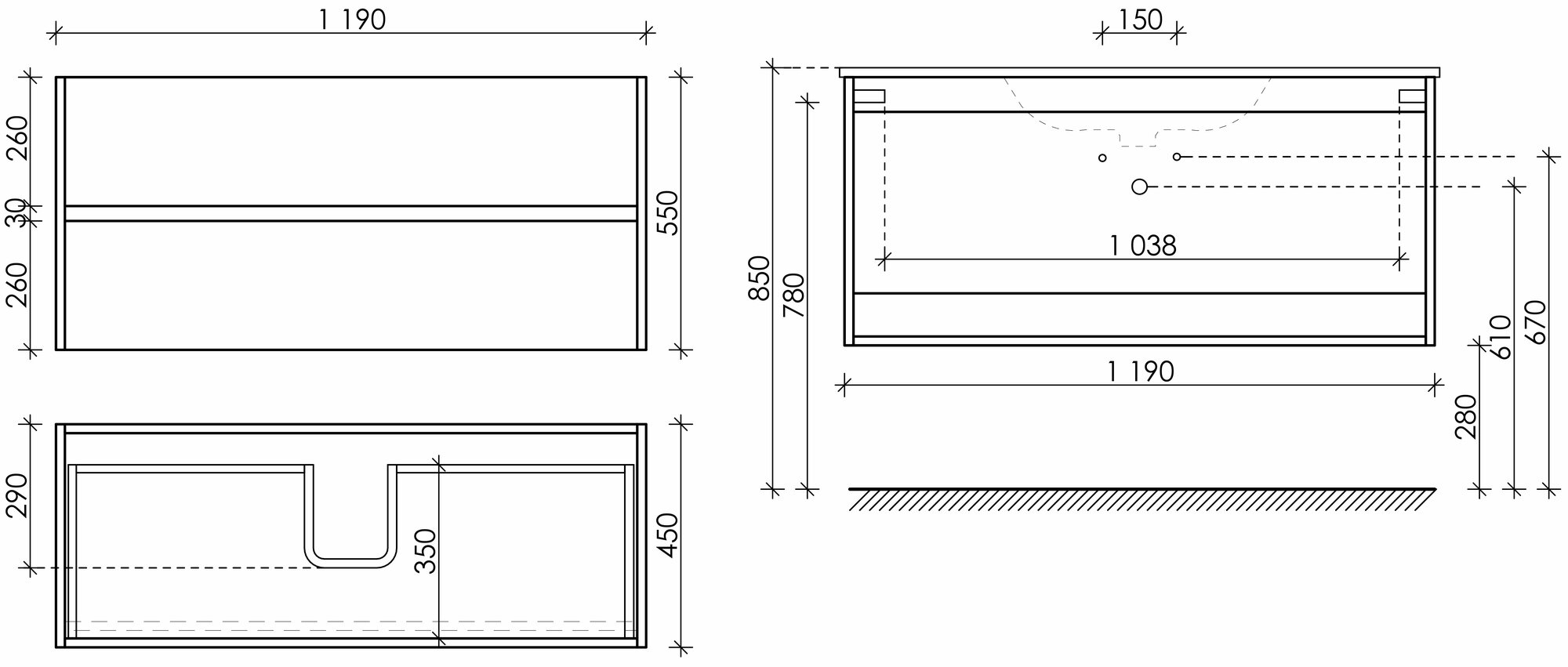 | Дополнительная информация | С двумя ящиками оснащенными доводчиками скрытого монтажа с системой Soft close (плавного закрывания), cручкой Gola по всей длине тумбы. |