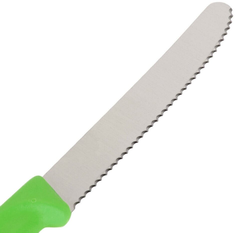 нож оснащен пластиковой рукоятью, которая обеспечивает удобное и надежное сцепление при работе. лезвие ножа имеет длину 11 см и выполнено из прочной нержавеющей стали, что гарантирует его долговечность и превосходную остроту. волнообразная заточка лезвия позволяет с легкостью нарезать различные продукты, сохраняя их текстуру и внешний вид. закругленный кончик лезвия делает нож безопасным в использовании, идеально подходящим для нарезки.