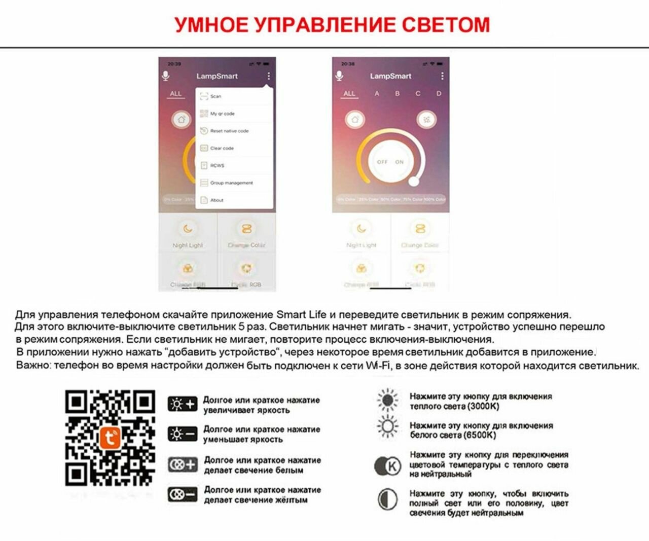 | Цветовая температура | 3000K (теплый свет) - 6000K (холодный свет) |