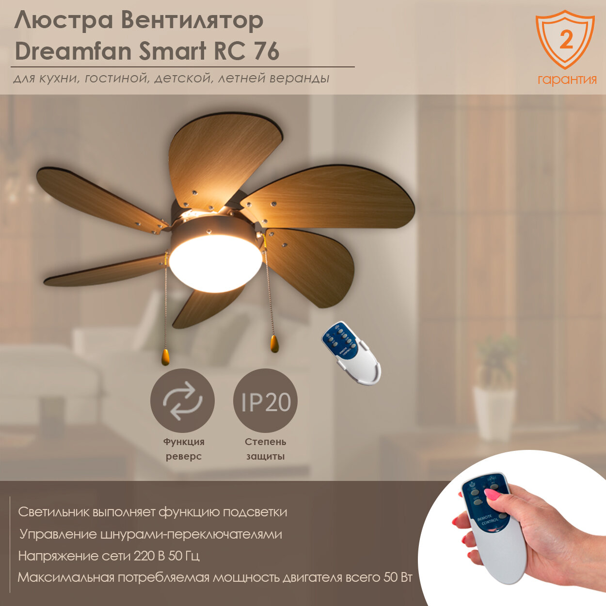 интерьера любых бытовых помещений. Люстра-вентилятор поддерживает три скоростных режима,