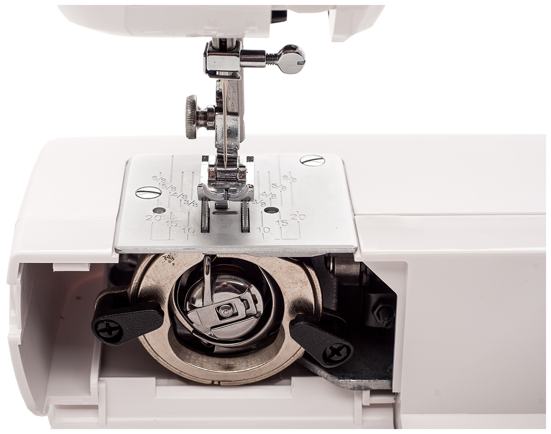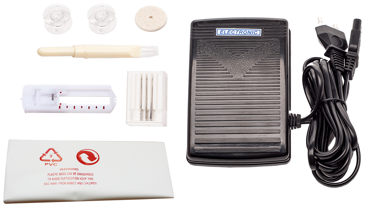 | Комплект поставки | Швейная машина, педаль, шнур питания, шпульки, набор игл, лапка универсальная, лапка для вшивания молнии, лапка для петель, документация |