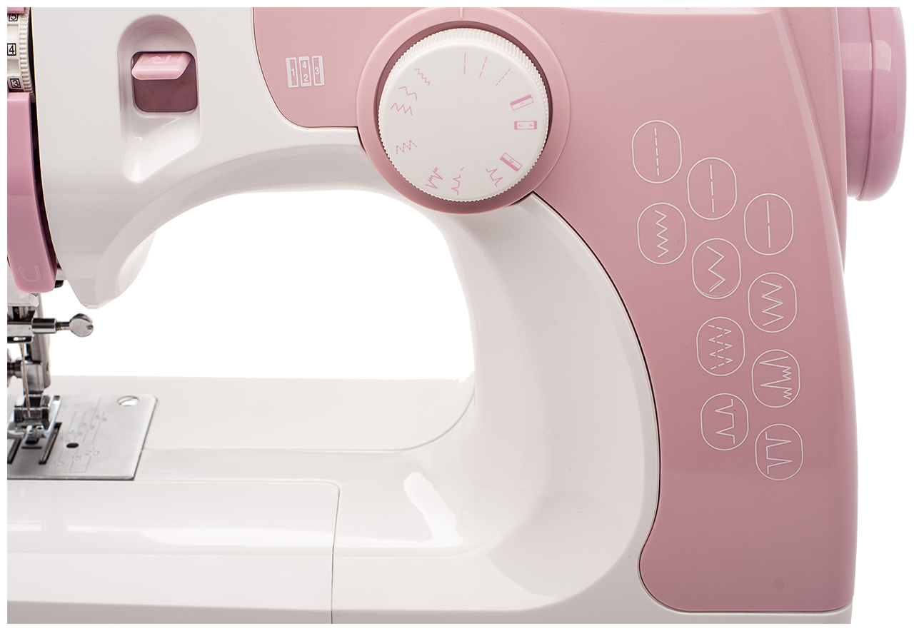 Швейная машина выполняет 11 операций, в том числе потайные и эластичные строчки. Максимальная длина стежка составляет 4 мм, а ширина - 5 мм. Чтобы шить в обратном направлении и усилить строчки, достаточно нажать кнопку реверса.