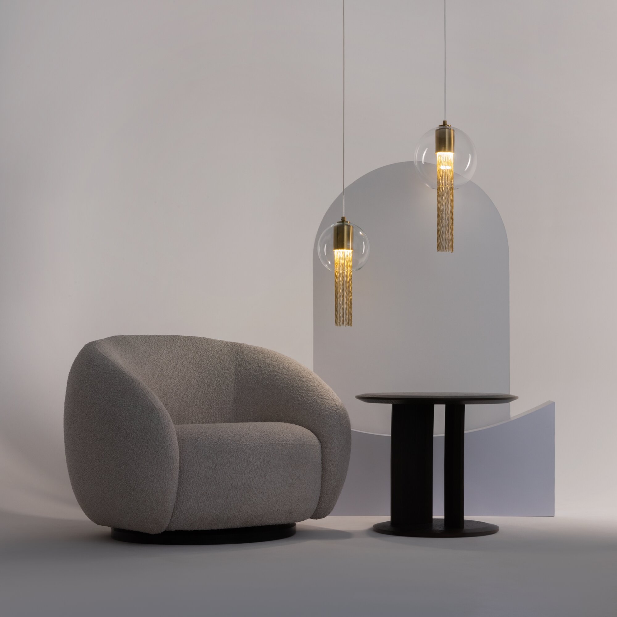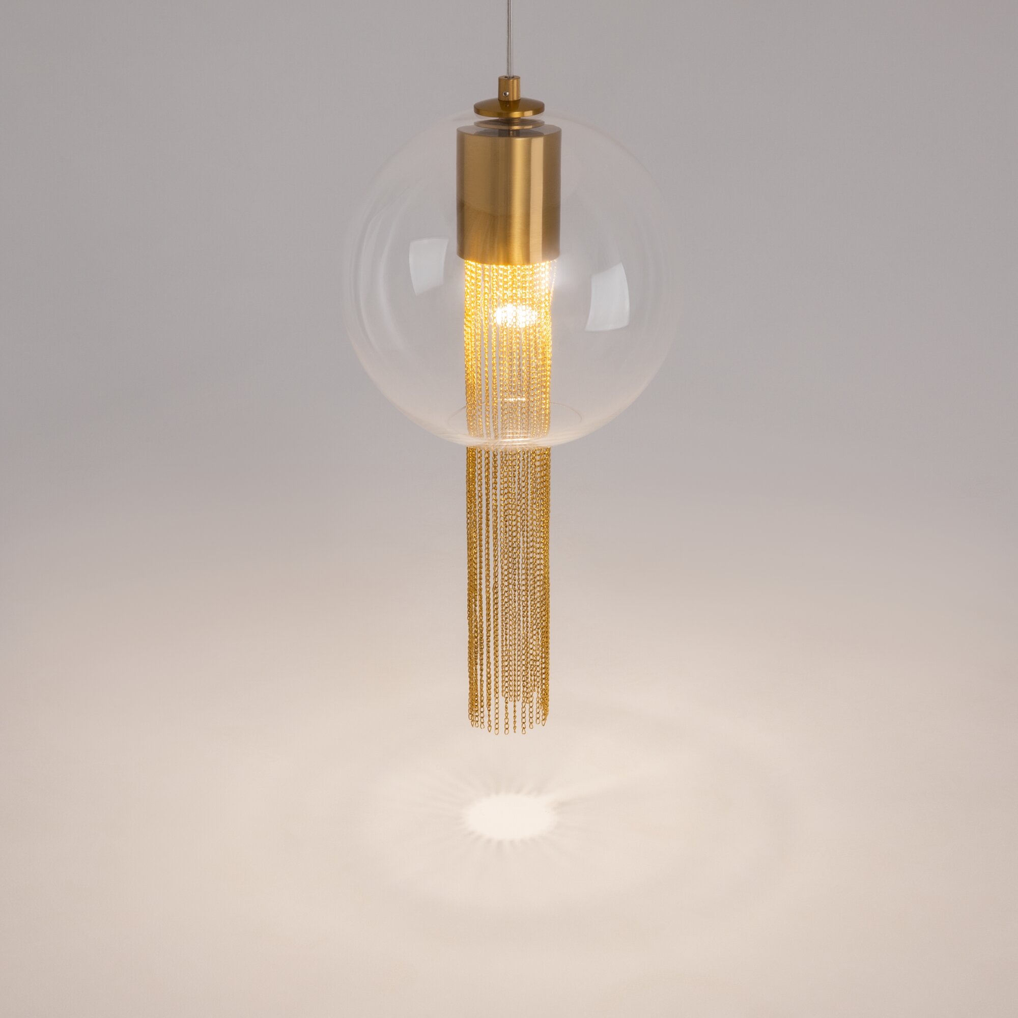 Многочисленные грани декоративных подвесок из кристаллов проецируют цветные блики на глянцевую поверхность стеклянной сферы. Арматура светильников изготовлена из металла и окрашена в два трендовых оттенка на выбор: хром и золото. Высоту светильников можно изменять, регулируя длину шнура. В серии представлены подвесы различного диаметра и люстра на 5 плафонов, что позволяет организовать как центральную, так и зональную подсветку.