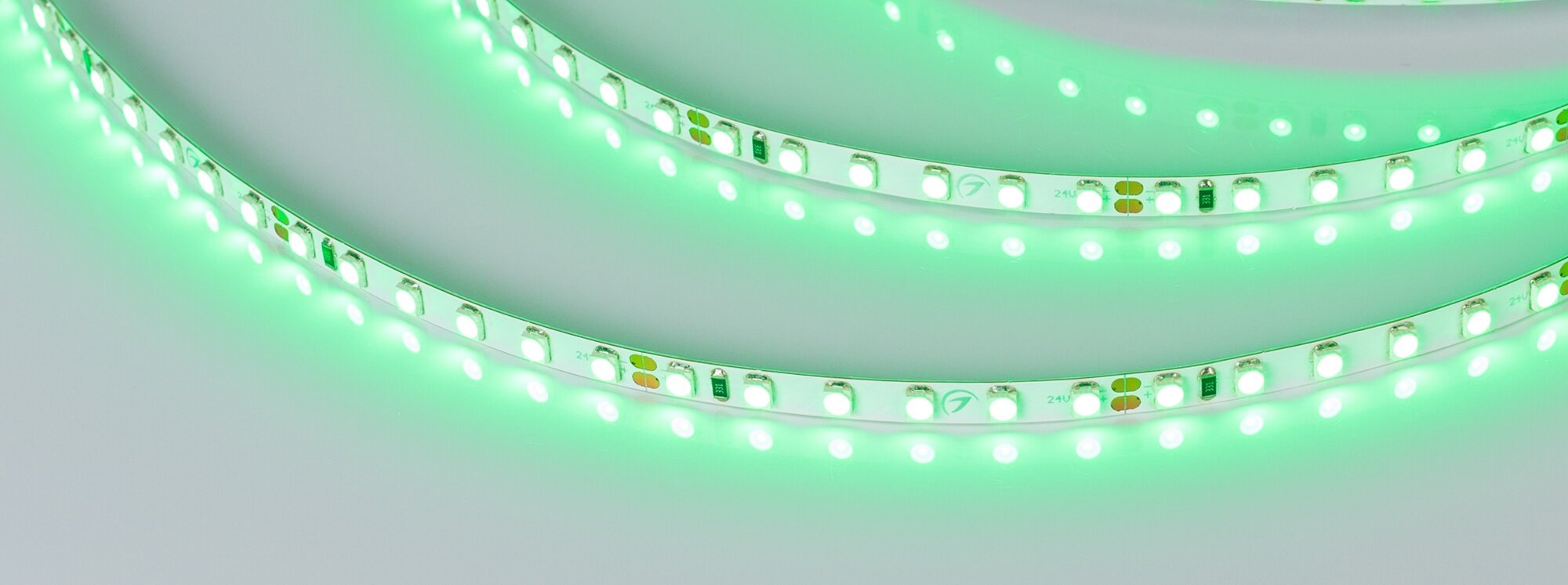 Узкая светодиодная лента 5 мм серии LUX с питанием 24 В и мощностью 9.6 Вт/м. Светодиоды 2х SMD 3528 зеленого цвета свечения с плотностью расстановки 120 шт/м. Степень пылевлагозащиты IP20.