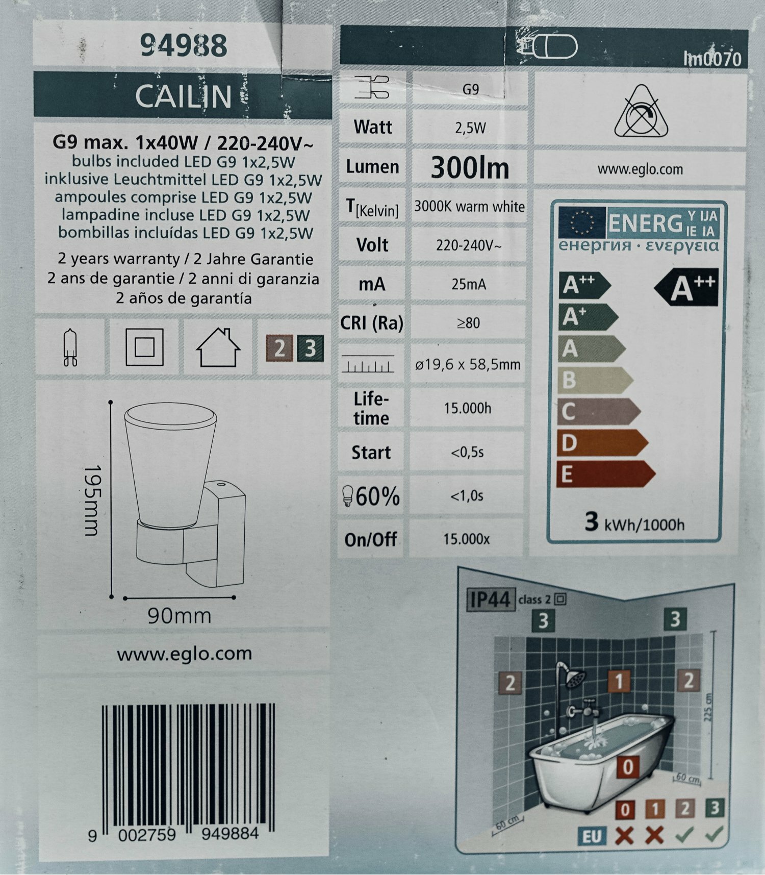 Также к товару прилагается лампа, с рекомендованным производителем типом цоколя – G9. Подсветка оснащена степенью защиты от влажности IP 44. Цвет свечения ламп теплый, с цветовой температурой в 3000 К. Светильник может освещать до 1,3 кв.м. площади. Рекомендованное для подключения устройства напряжение – 220 В. Изящный дизайн и качество самого прибора не оставит равнодушным даже самого придирчивого покупателя.