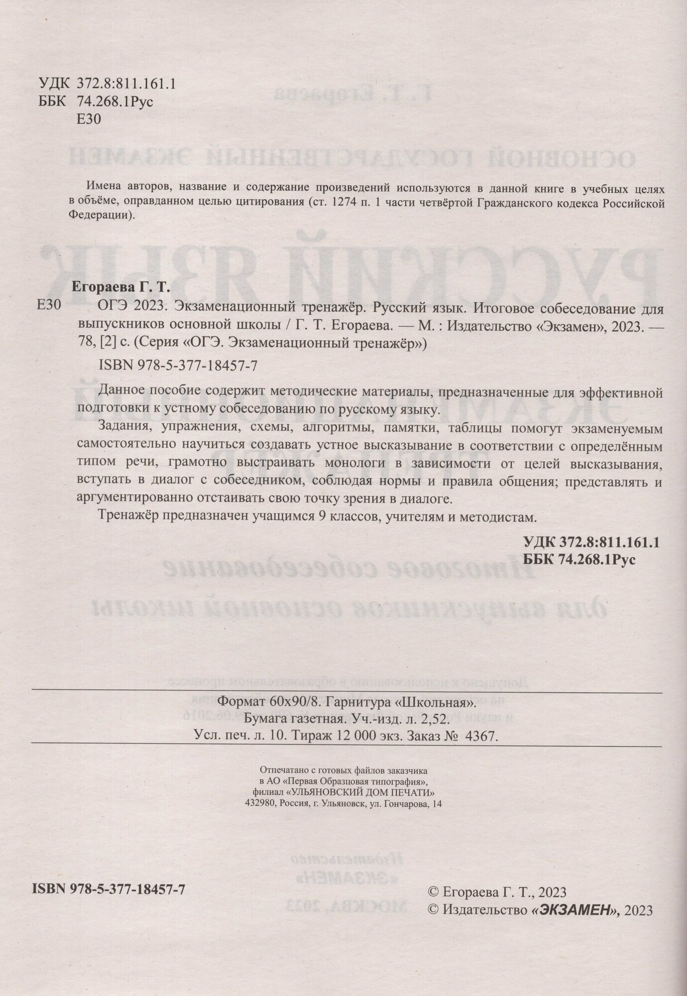 ОГЭ 2023 Русский язык Экзаменационный тренажер Итоговое собеседование для выпускников основной школы (Егораева Галина Тимофеевна); Экзамен, 2023